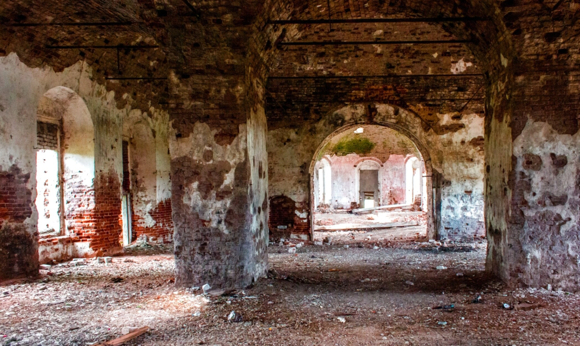 На представленной фотографии запечатлён интерьер Церкви Вознесения Господня, расположенной в селе Цыкино Нижегородской области. Храм, находящийся в полуразрушенном состоянии, демонстрирует следы былого величия православной архитектуры.