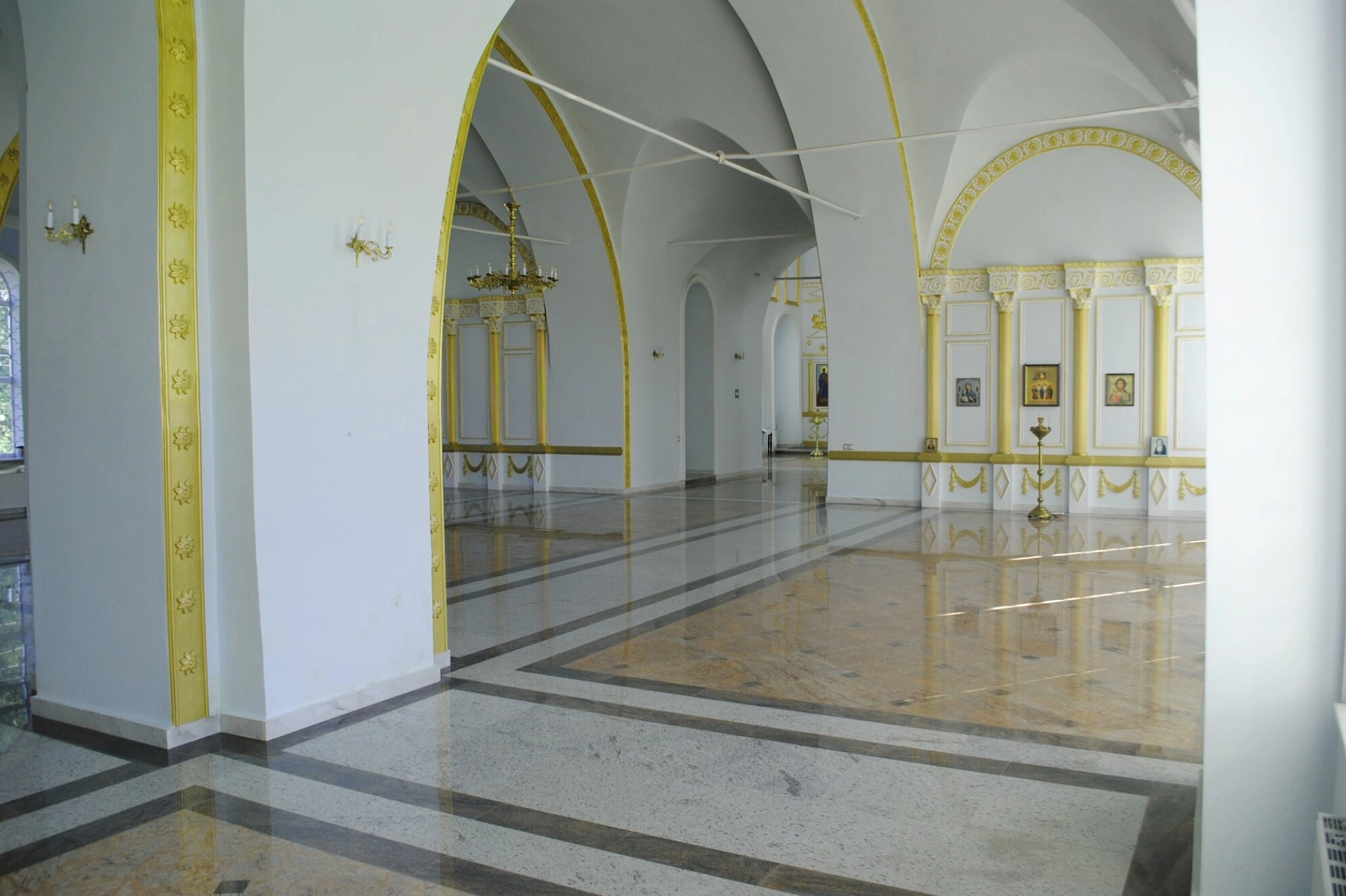 Вдоль стен возвышаются стройные колонны, между которыми расположены арочные ниши. В этих нишах, а также на стенах, размещены святые иконы и настенные росписи, являющиеся неотъемлемой частью убранства православного храма. Присутствуют и элементы церковной утвари, такие как стационарные подсвечники, готовые к принятию свечей от молящихся. Всё внутреннее устроение храма — от архитектурных линий до каждого предмета — направлено к созданию молитвенного настроения и сосредоточенности, напоминая верующим о горнем мире и вечных ценностях.