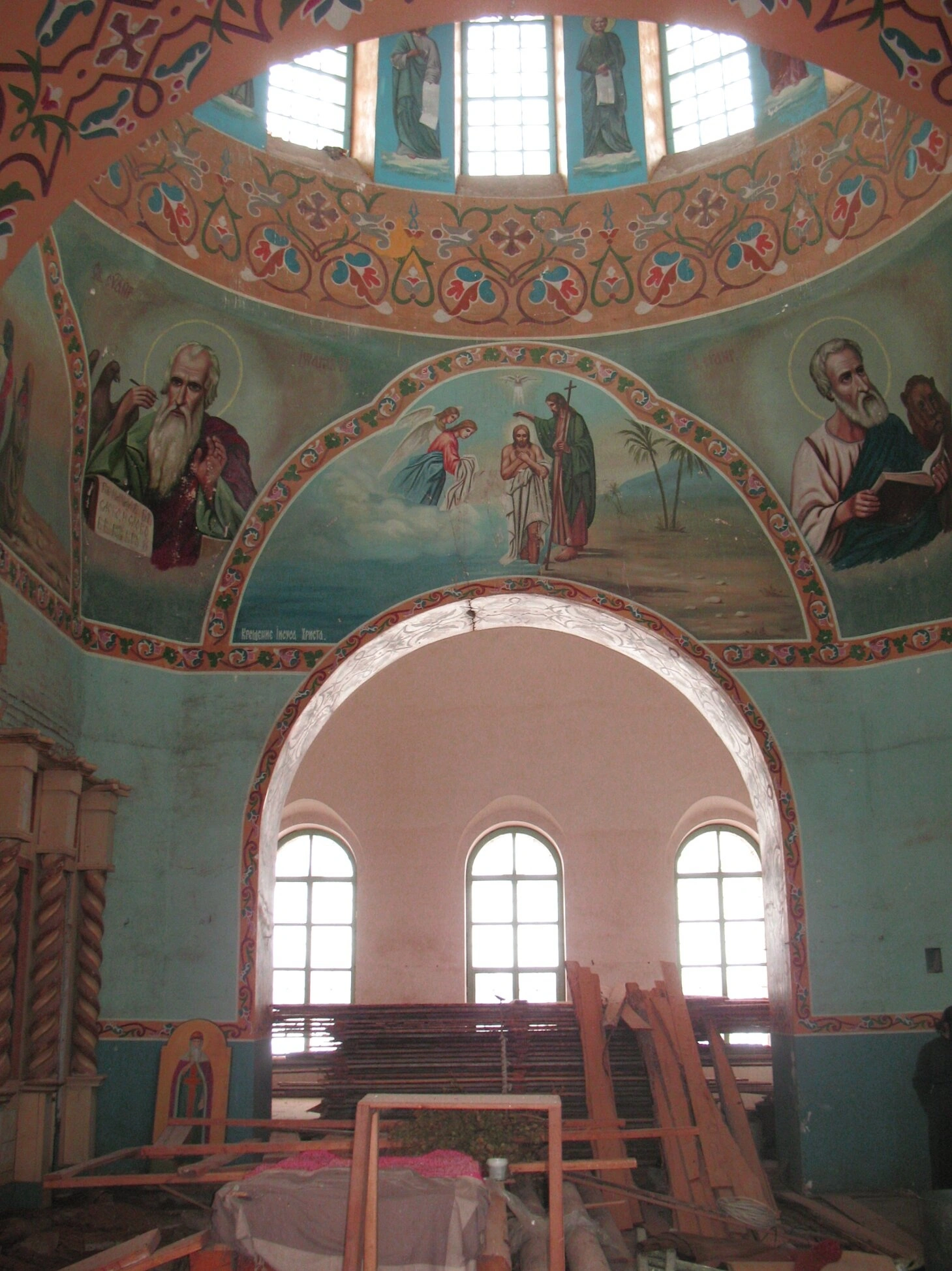 Особое внимание приковывает состояние храма, свидетельствующее о ведущихся реставрационных работах. В нижней части снимка видны строительные материалы, что говорит о непрестанных трудах по восстановлению былого благолепия этой святыни. Сквозь арочные оконные проёмы обильно проникает естественный свет, озаряя древние стены и подчёркивая художественную выразительность сохранившихся росписей.