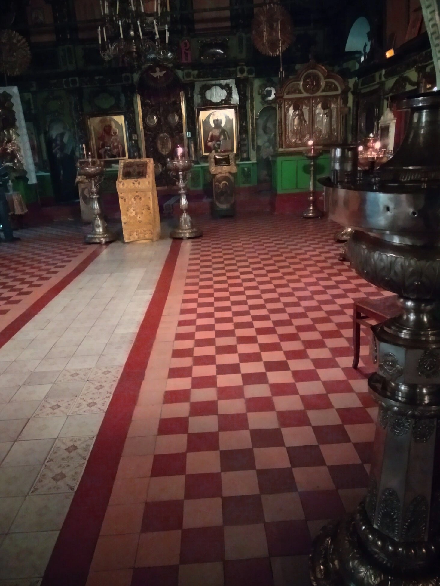 Центральным элементом композиции является богато украшенный иконостас, чьи резные детали и оклады икон мерцают в свете огней. В правой части кадра располагается массивная металлическая купель, предназначенная для совершения таинства освящения воды. Перед святыми образами установлены подсвечники, уставленные горящими свечами, что свидетельствует о молитвенном настроении прихожан.
