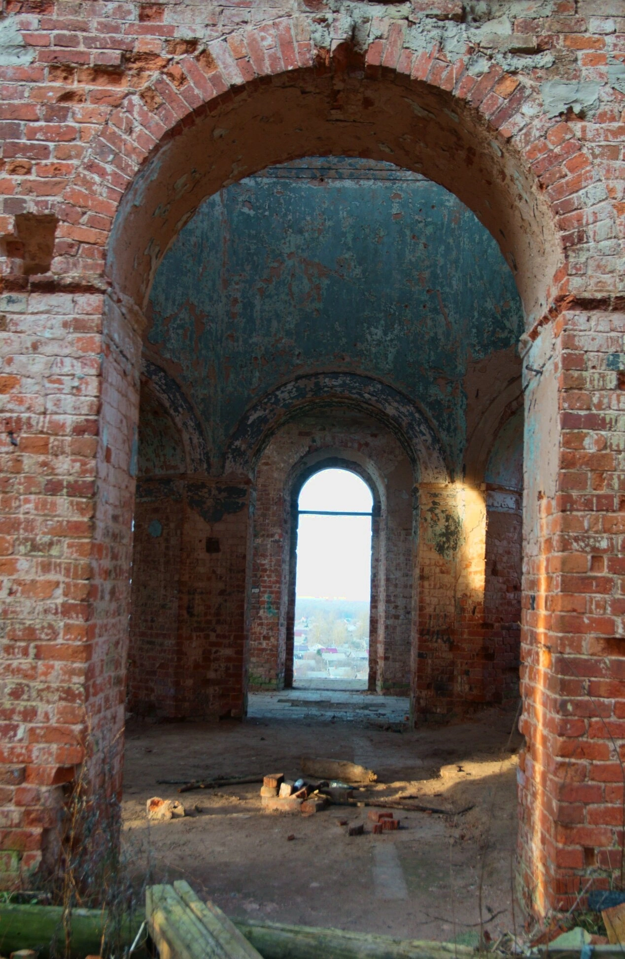 На представленной фотографии запечатлен интерьер храма Введения во храм Пресвятой Богородицы с приделом великомученицы Екатерины, расположенного на Бронницкой горе в Новгородской области. Святыня, находящаяся в заброшенном состоянии, демонстрирует величественную архитектуру православного зодчества.