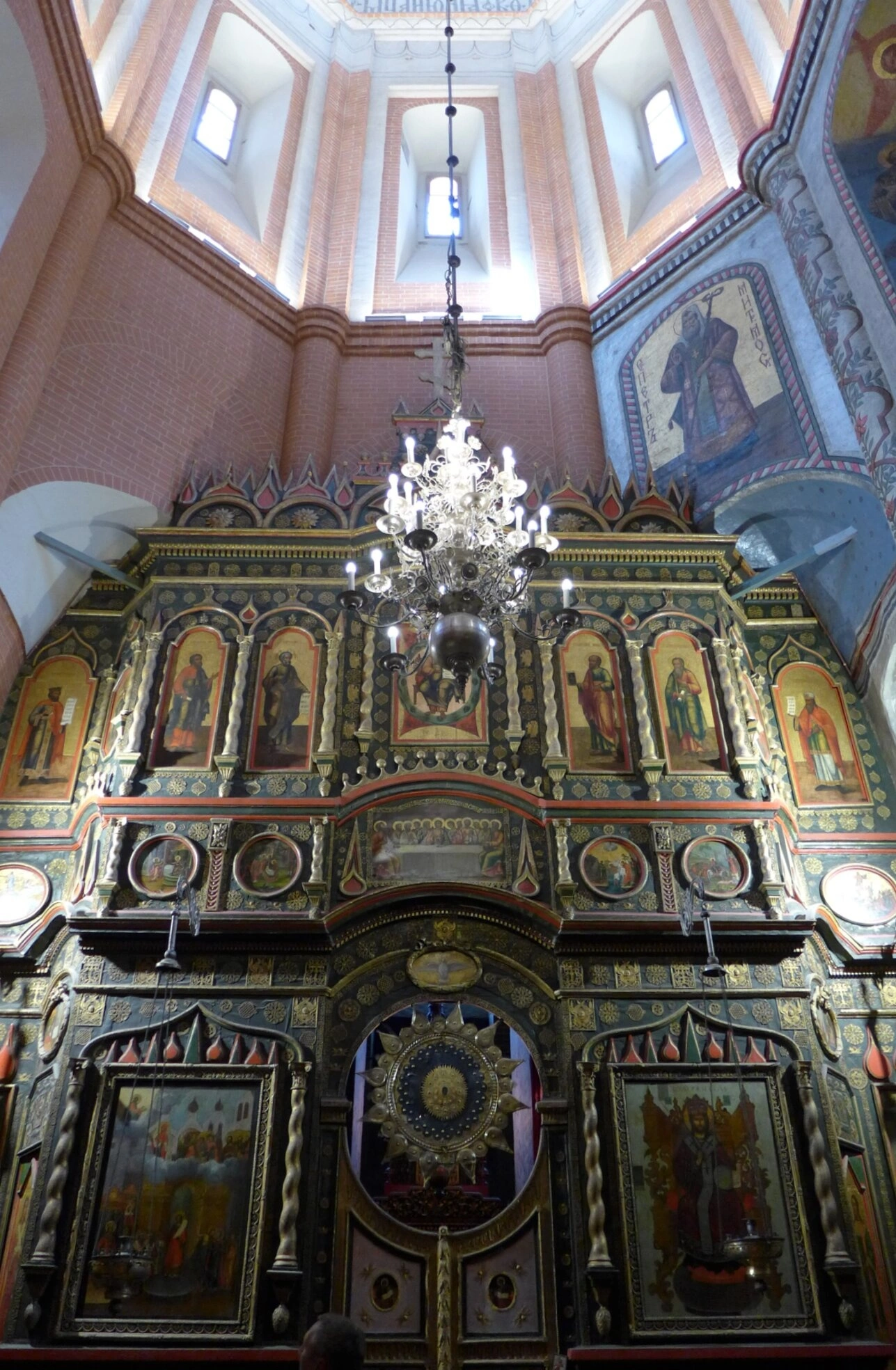 Центральное место в композиции занимает величественный иконостас. В Покровском соборе пребывает уникальное собрание из одиннадцати иконостасов, созданных в разное время и представляющих эволюцию русского церковного искусства. На фотографии может быть запечатлён либо тябловый иконостас, лаконичная конструкция которого подчёркивает святость древних образов, либо пышный каркасный иконостас XVIII–XIX столетий, где резной, золочёный декор, символизирующий красоту Горнего мира, обрамляет иконы. В местном ряду каждого иконостаса, по канону, обязательно присутствуют образы Спасителя и Пресвятой Богородицы.
