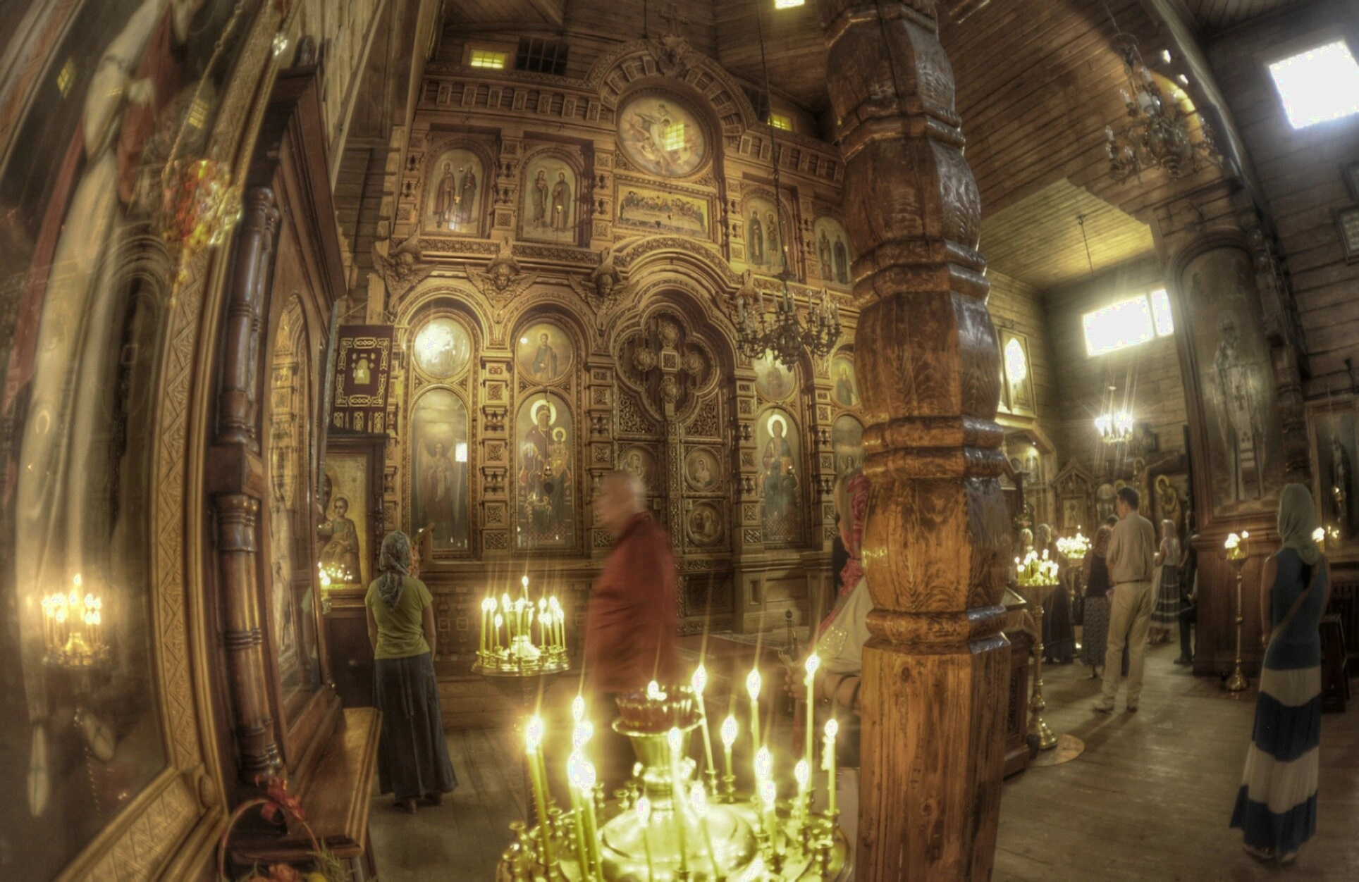 Центром сакрального пространства и композиции снимка выступает величественный многоярусный иконостас, богато украшенный резьбой. В традиционном храмовом устройстве иконостас, отделяющий алтарь от основного помещения, представляет собой образ Небесной Церкви и духовную вершину интерьера. Его иконы, освещенные трепещущим светом свечей, создают молитвенный фокус. Освещение в храме приглушенное и теплое, формируемое множеством зажженных свечей в подсвечниках и скудным естественным светом из небольших оконцев под кровлей. Такая игра света и тени подчеркивает фактуру дерева и наполняет пространство ощущением благоговейного покоя и уюта.