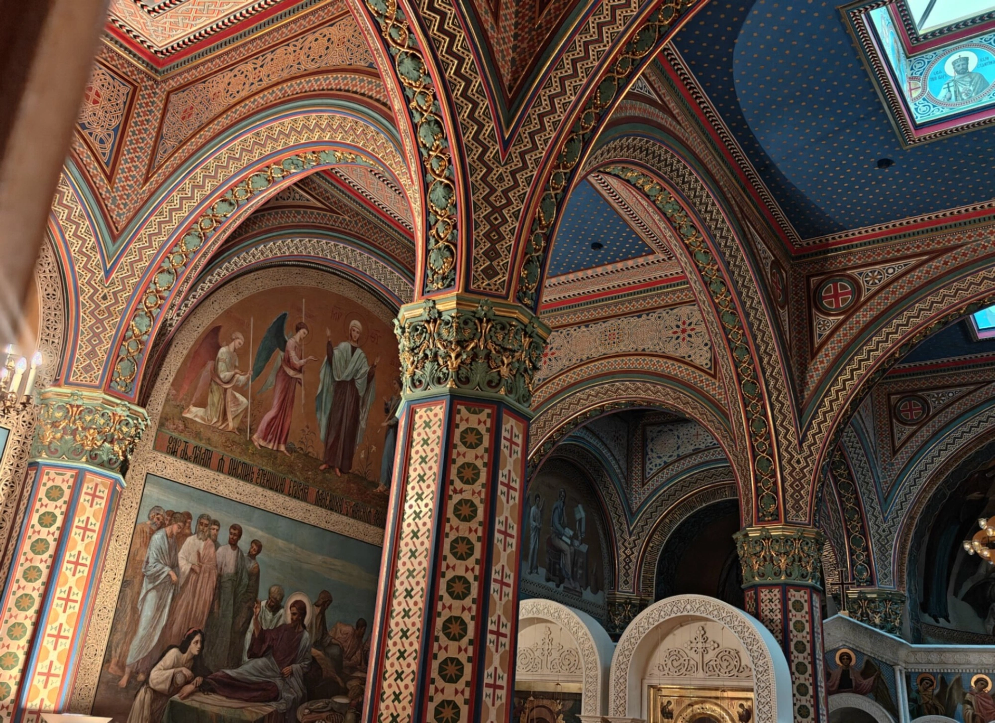 Сводчатый потолок окрашен в тёмно-синий цвет и усыпан золотыми звёздами, создавая образ ночного неба. В центральном кессоне потолка помещён образ святого или Спасителя. В правой части кадра видна часть массивной люстры, а в нижней – арочные проёмы, ведущие в смежные помещения или к иконостасу, украшенные позолоченными элементами.
