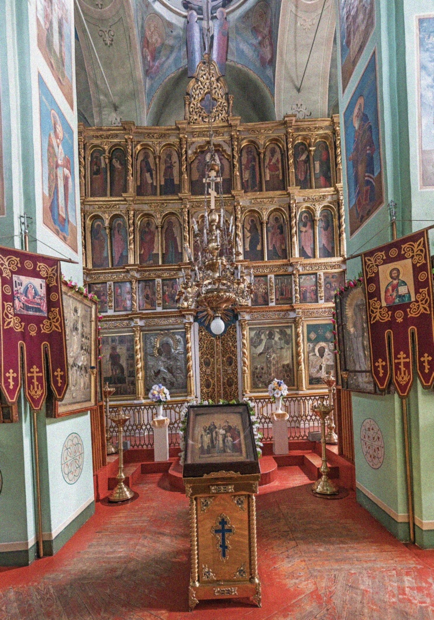На представленной фотографии запечатлён интерьер одного из древнейших православных храмов Новгородской земли — церкви Святого Великомученика Георгия Победоносца, что в городе Старая Русса. Святыня, возведённая в XV столетии, является выдающимся памятником русского церковного зодчества и духовным центром города.