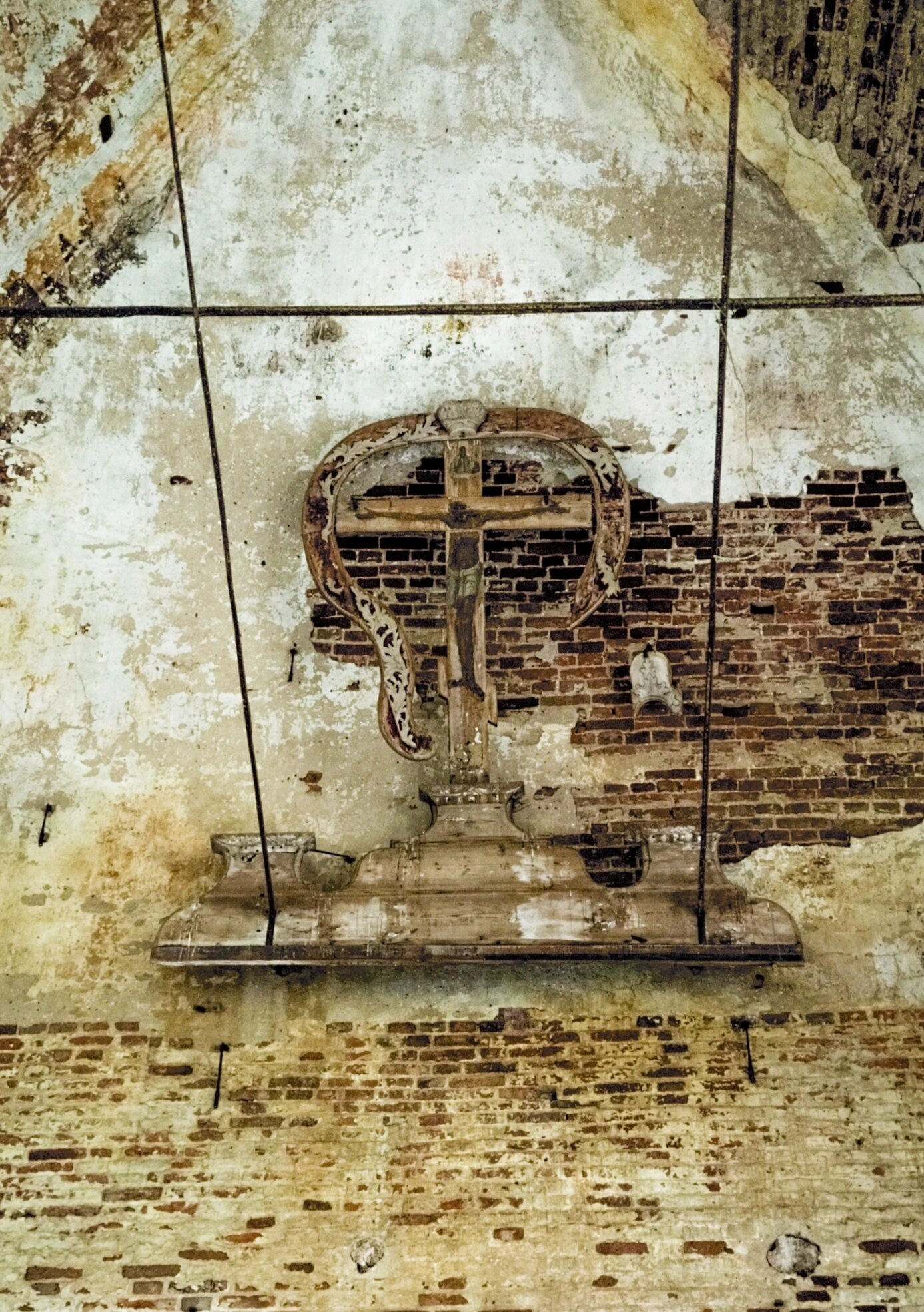 В центре композиции возвышается деревянное распятие с изображением распятого Господа нашего Иисуса Христа. Крест укреплён на массивном деревянном постаменте, а над главой Спасителя расположен резной элемент, напоминающий святой нимб или церковную арку. Этот сакральный образ, сохраняющий своё духовное значение даже в разрушающемся храме, является композиционным центром фотографии.