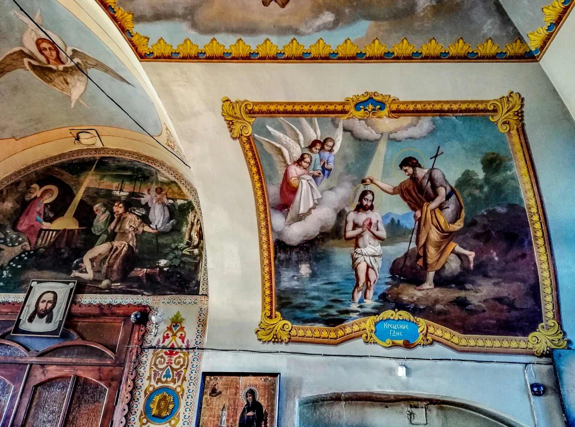 На представленной фотографии запечатлён величественный интерьер православного храма, богато украшенный настенными росписями и священными образами. Центральное место в композиции занимает монументальная фреска, изображающая евангельское событие — Крещение Господне в водах Иордана. Спаситель представлен в момент совершения таинства Иоанном Предтечей, а над Ним парит в лучезарном сиянии голубь — символ Сошествия Святого Духа. По сторонам от центральной сцены располагаются ангельские чины, благоговейно внимающие великому событию.