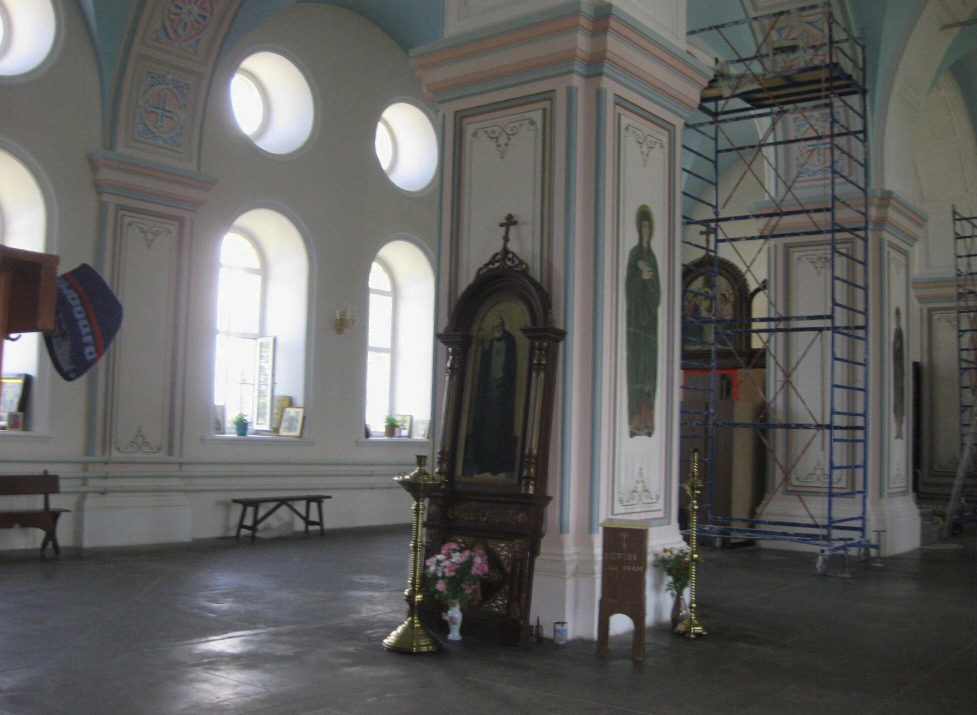 Архитектурное пространство отличают высокие сводчатые потолки, создающие ощущение небесной выси, и арочные оконные проёмы, через которые в дом Божий обильно проникает естественный свет. Присутствие строительных лесов указывает на проведение реставрационных либо восстановительных работ, направленных на сохранение уникального исторического памятника. Деревянные лавки для прихожан готовы к принятию молящихся.