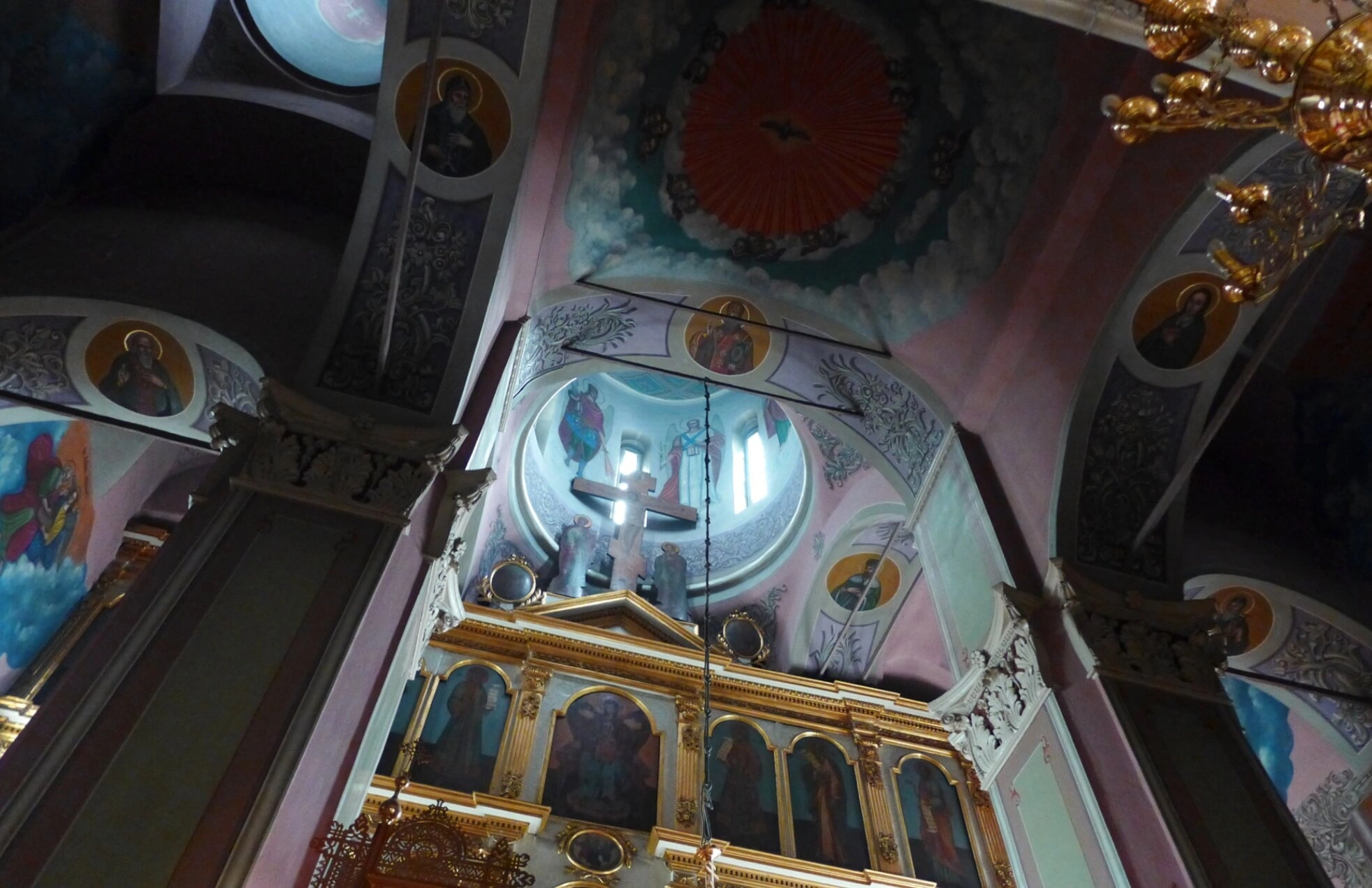 Центральное место в композиции занимает великолепный многоярусный иконостас, украшенный резьбой и золочеными окладами икон. Над царскими вратами возвышается Распятие, являющееся смысловым и духовным центром всего храмового пространства. Иконы в иконостасе расположены в строгом соответствии с канонами православной церкви.