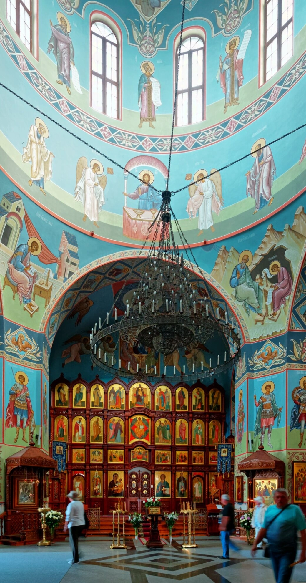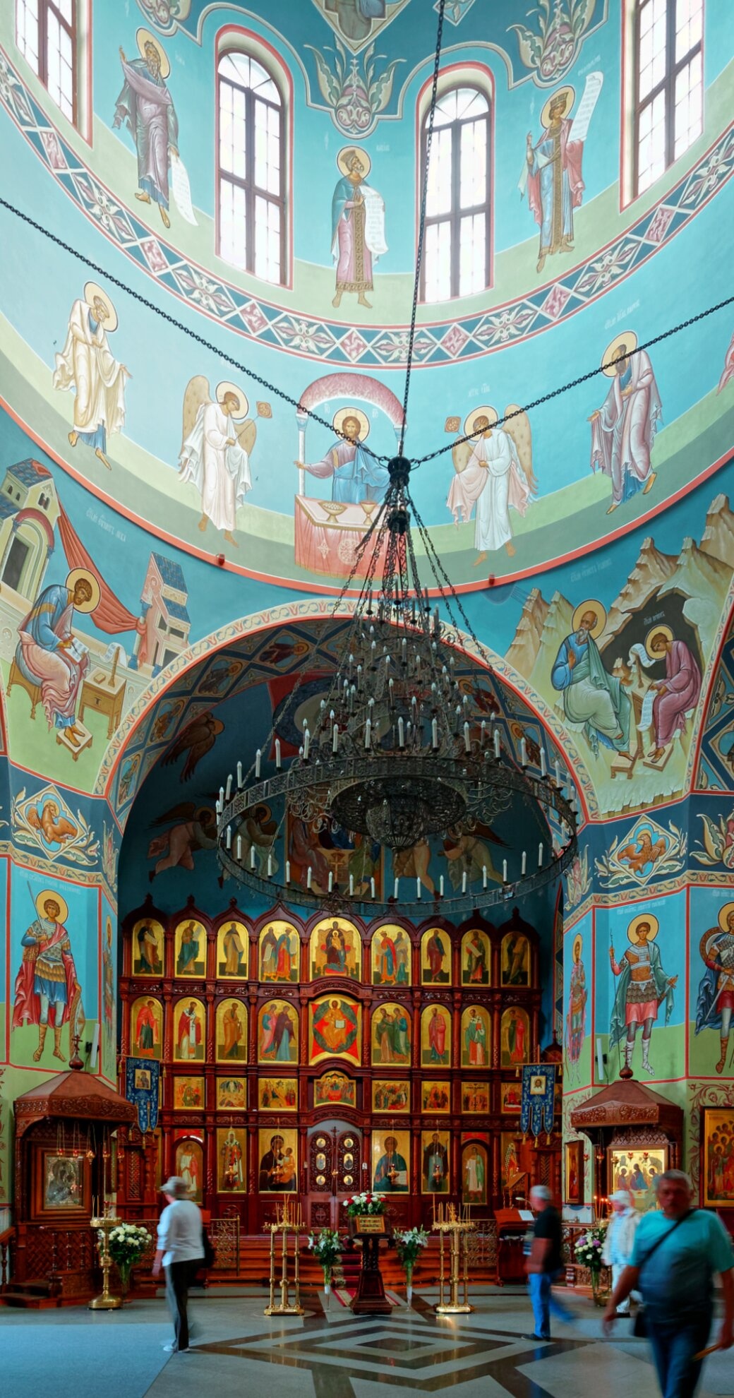 В центре композиции обращает на себя внимание массивное паникадило, традиционное церковное светильник, символизирующее собою Небесный Иерусалим. Его свет мягко освещает росписи на стенах и сводах храма, выполненные в канонической православной манере. Внимательный взгляд различит лики святых угодников и сцены из Священного Писания, которые назидают верующих и создают особую молитвенную атмосферу.