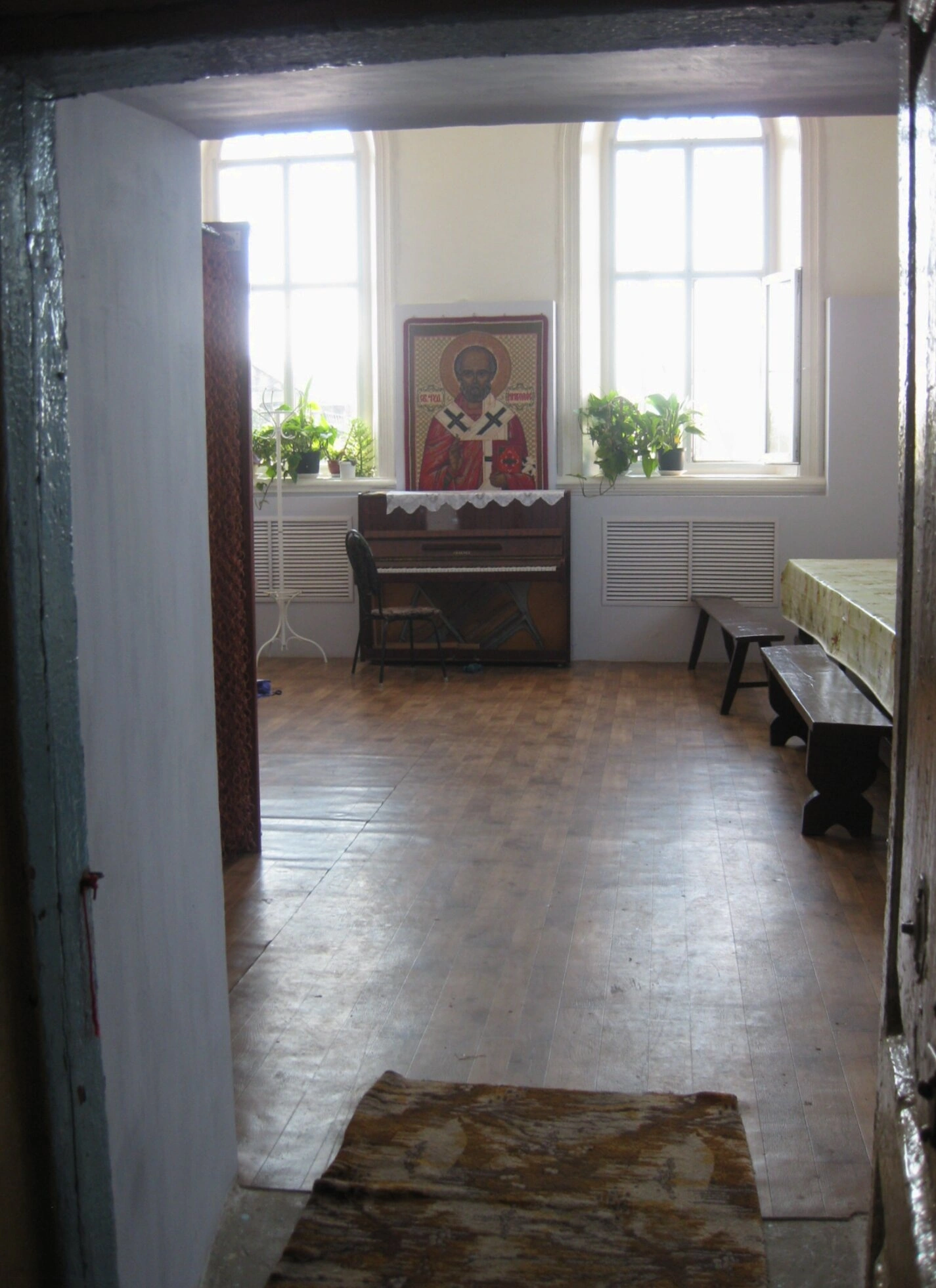 Обилие дневного света, льющегося из окон, и множество ухоженных комнатных растений на подоконниках создают атмосферу уюта и живой, дышащей благодати. Справа от рояля располагается стол, накрытый скатертью, и скамьи, готовые применить богомольцев. Белые стены и светлое деревянное напольное покрытие дополняют ощущение чистоты и духовной ясности.