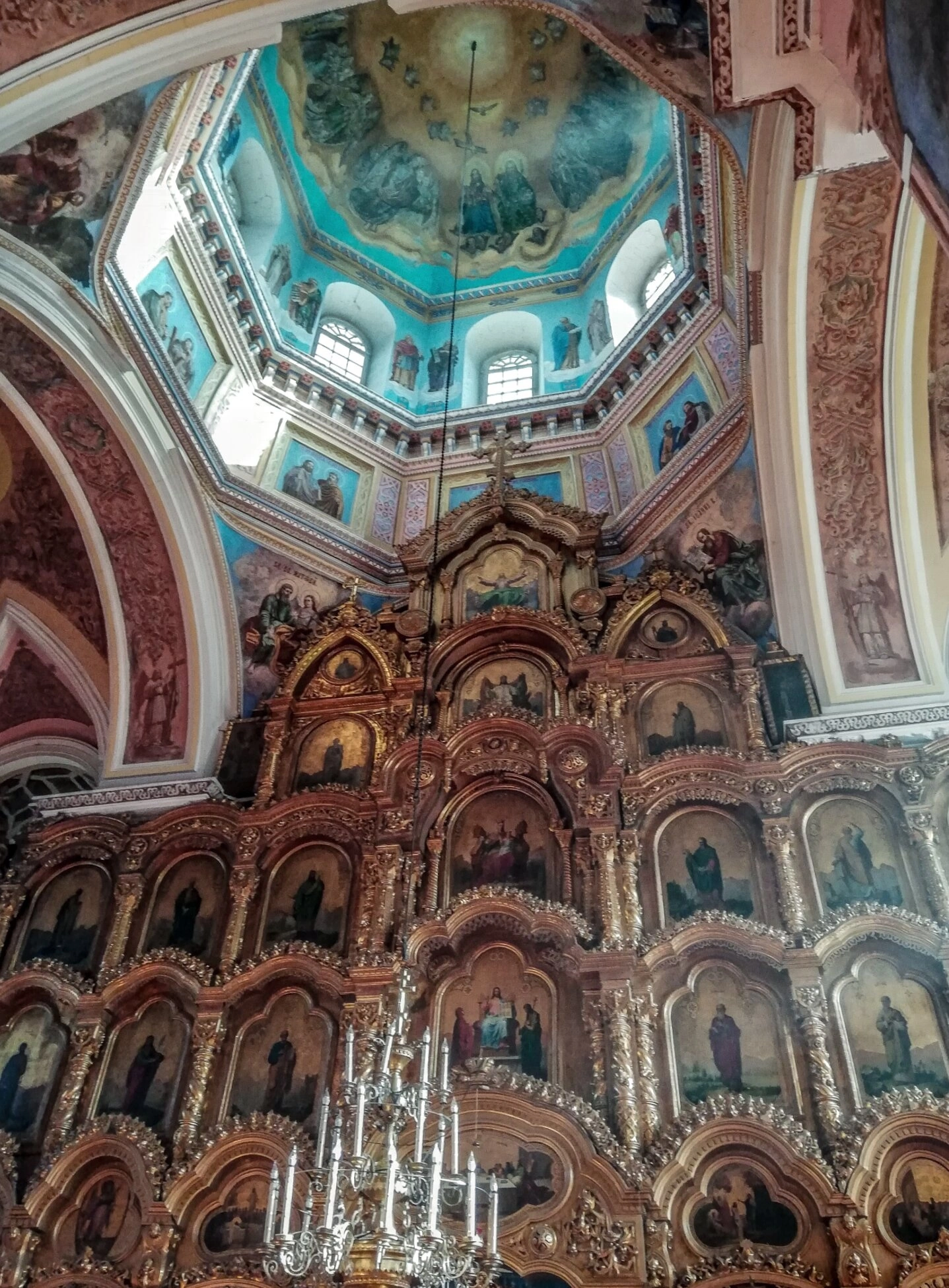 Над иконостасом взмывает ввысь просторный купол, внутренняя поверхность которого и своды храма покрыты монументальной фресковой росписью. Росписи изображают Господа Вседержителя, сонмы святых и библейские сцены, выполненные в традиционной для православной храмовой живописи цветовой гамме, где преобладают небесные лазурные тона и благодатное золото.