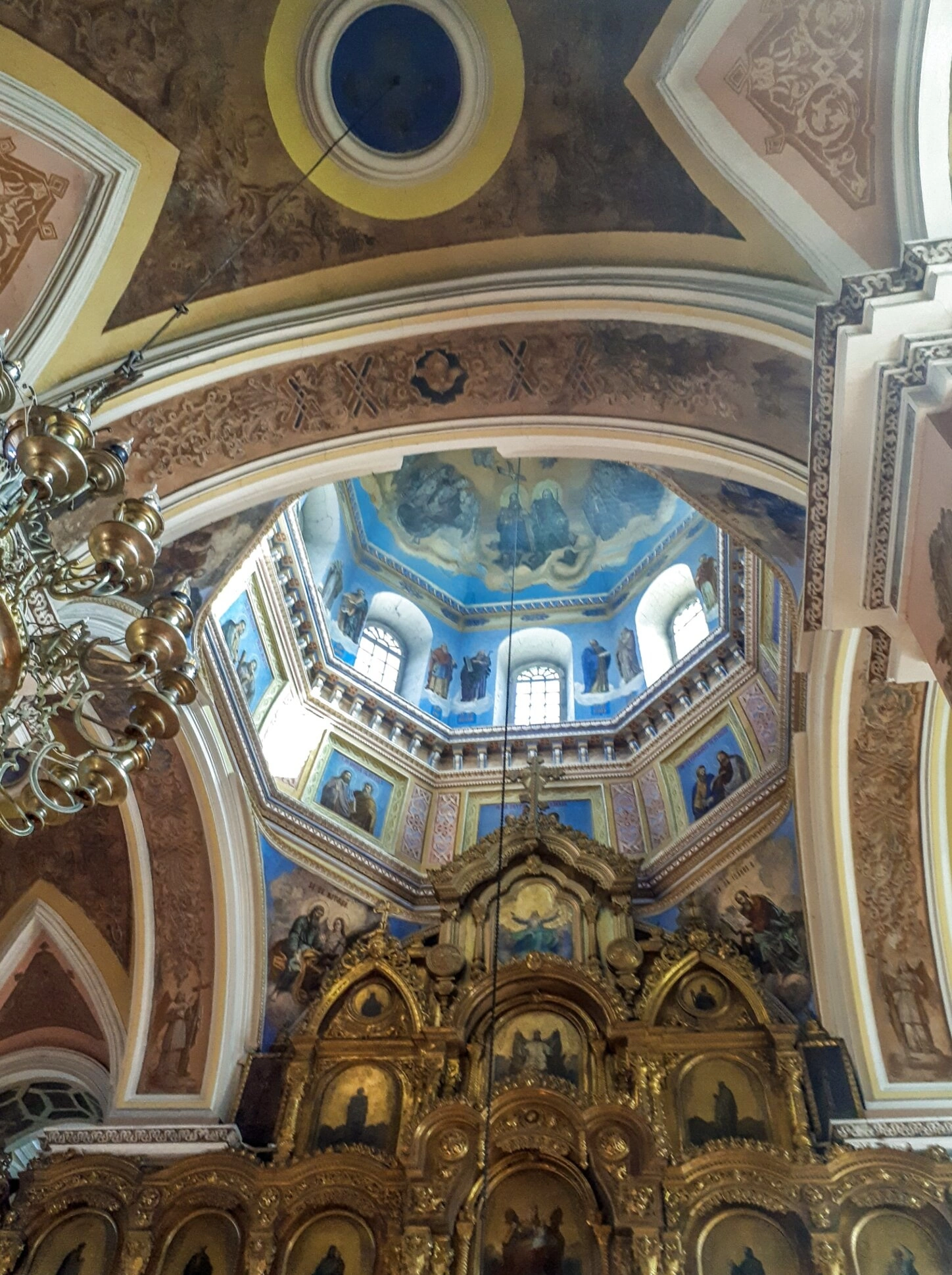 Слева в интерьере висит массивное паникадило – центральная храмовая люстра, отлитая из латуни и украшенная хрустальными подвесками. При освещении оно создаёт особую молитвенную атмосферу, отражая свет от позолоченных поверхностей иконостаса.