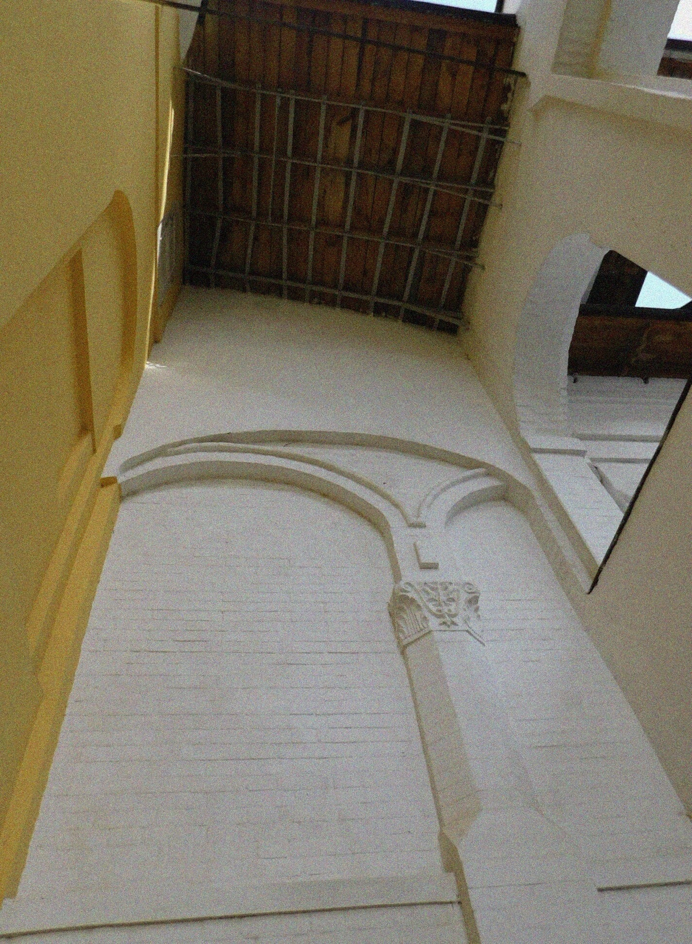 Высокие стены, сложенные из белого камня и кирпича, украшены мощными арочными проёмами и сводами, характерными для русского церковного зодчества. Верхнюю часть композиции венчает деревянное перекрытие с открытыми балками, что свидетельствует о древности постройки.