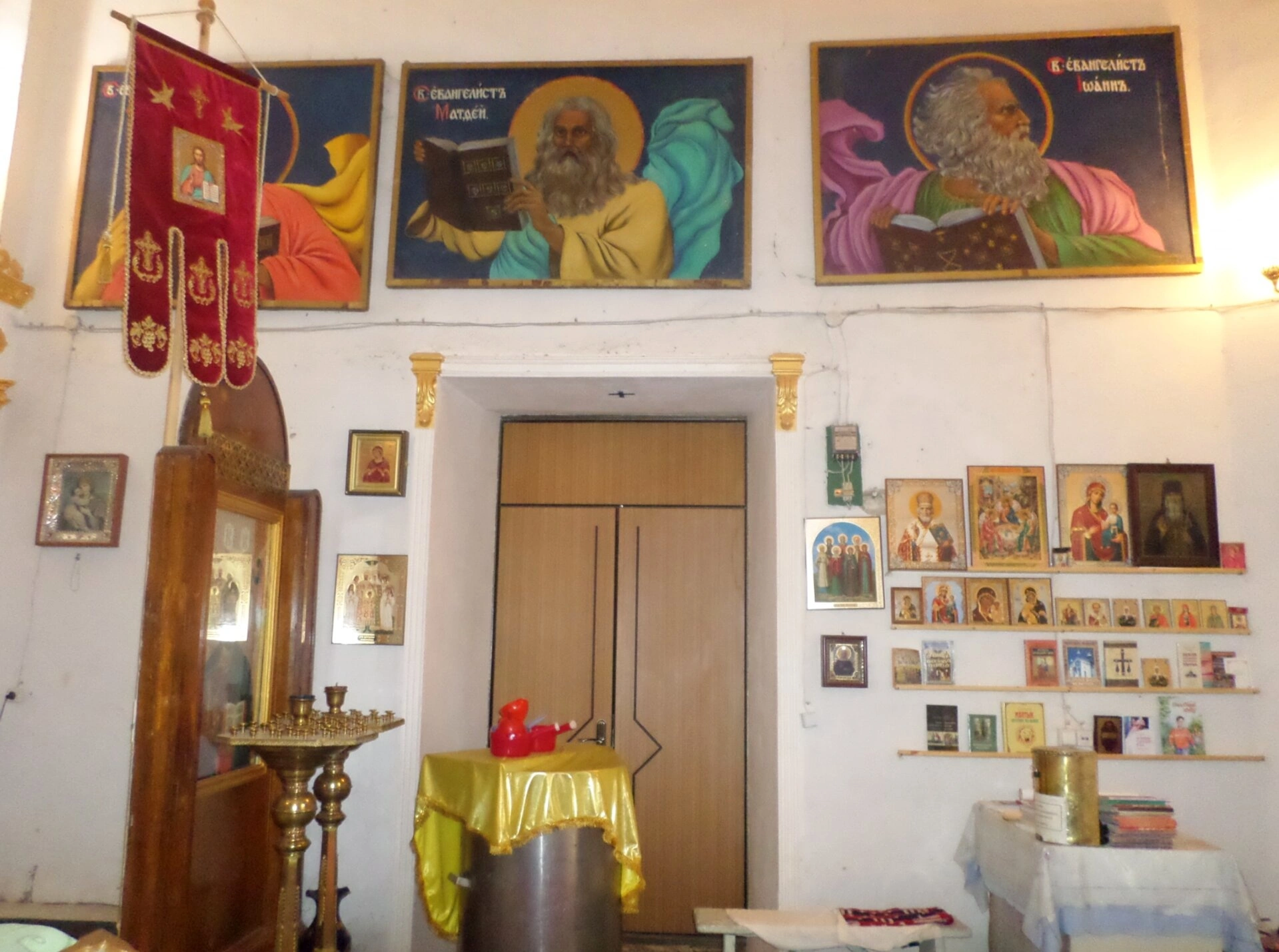 В левой части интерьера находится центральный аналой, предназначенный для чтения Святого Евангелия во время богослужения. Он облачён в праздничный красный покров с вышивкой, символизирующий торжество и жертвенную любовь. Рядом установлен металлический подсвечник, на котором верующие оставляют свои свечи о здравии и упокоении.
