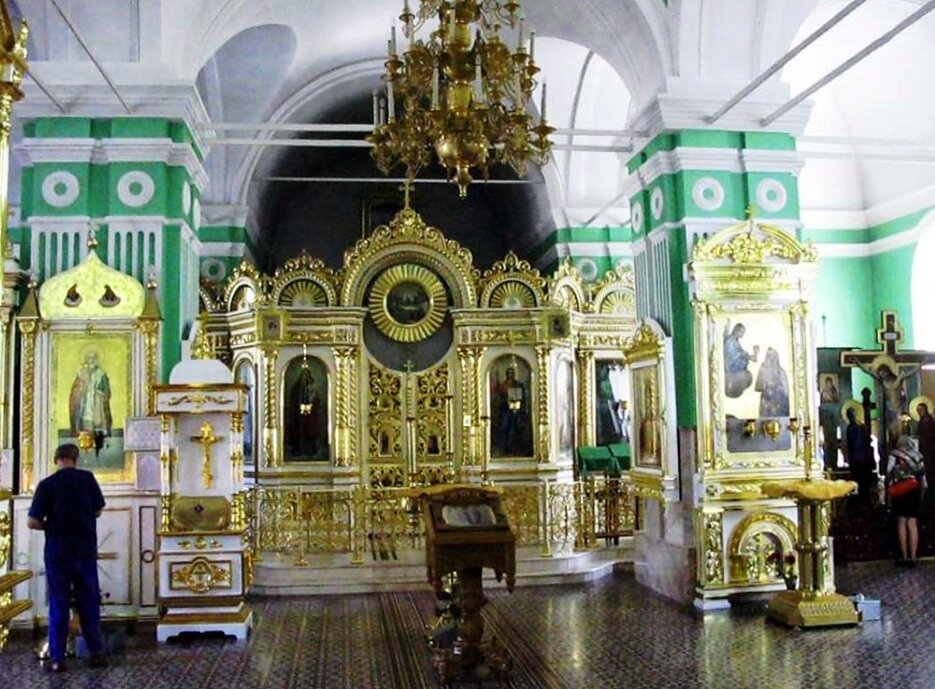Снимок демонстрирует благолепие церковного интерьера, выполненного в светлых, жизнеутверждающих тонах. Стены окрашены в спокойный зелёный цвет, который гармонично сочетается с белоснежными элементами отделки и обилием золота, создавая атмосферу торжественности и благодати. Центральное место в композиции занимает величественный многоярусный иконостас, искусно выполненный из дерева и покрытый сусальным золотом. Его целостность и сохранность с момента постройки храма являются особой ценностью.