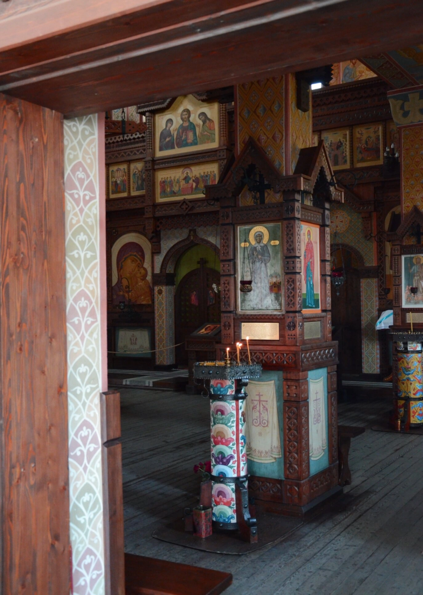 Особого внимания заслуживает искусная резьба по дереву, покрывающая не только иконостас, но и стены, и потолочные конструкции храма. Деревянные поверхности украшены изящными орнаментами и декоративными элементами, демонстрирующими высокий уровень craftsmanship местных мастеров. Светлые тона росписей создают ощущение лёгкости и духовной чистоты.