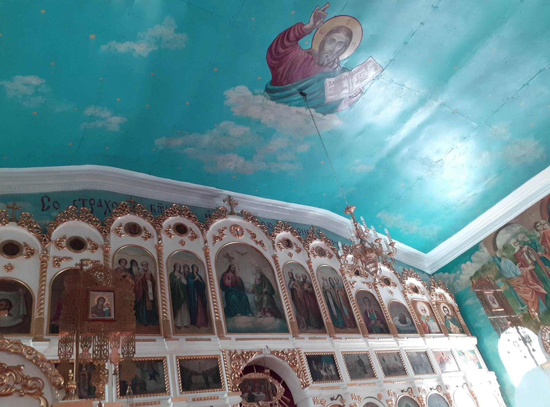 Взгляд невольно устремляется ввысь, к росписи на своде потолка, где в окружении лёгких облаков на небесно-голубом фоне помещён образ Господа Вседержителя. Эта фреска, символизирующая Небесный Иерусалим, наполняет пространство храма светом и напоминает молящимся о вечной жизни.