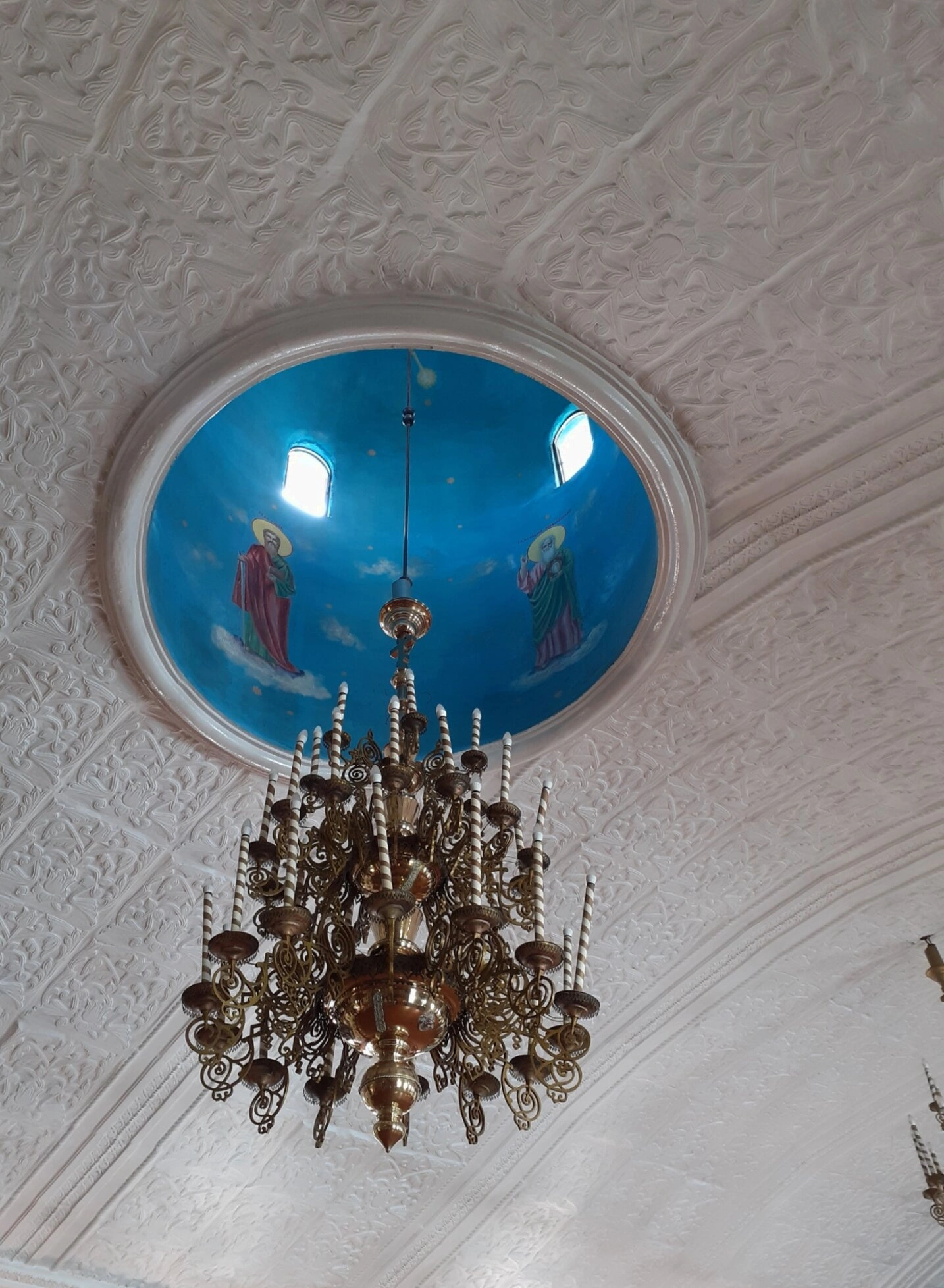 Центральным элементом композиции выступает высокий небесно-голубой купол, символизирующий горний мир. Его свод украшен искусной фресковой росписью, изображающей святых угодников в традиционных византийских одеяниях. Два небольших оконных проёма в верхней части купола, называемые люнетами, наполняют пространство храма божественным светом, создающим особую молитвенную атмосферу.