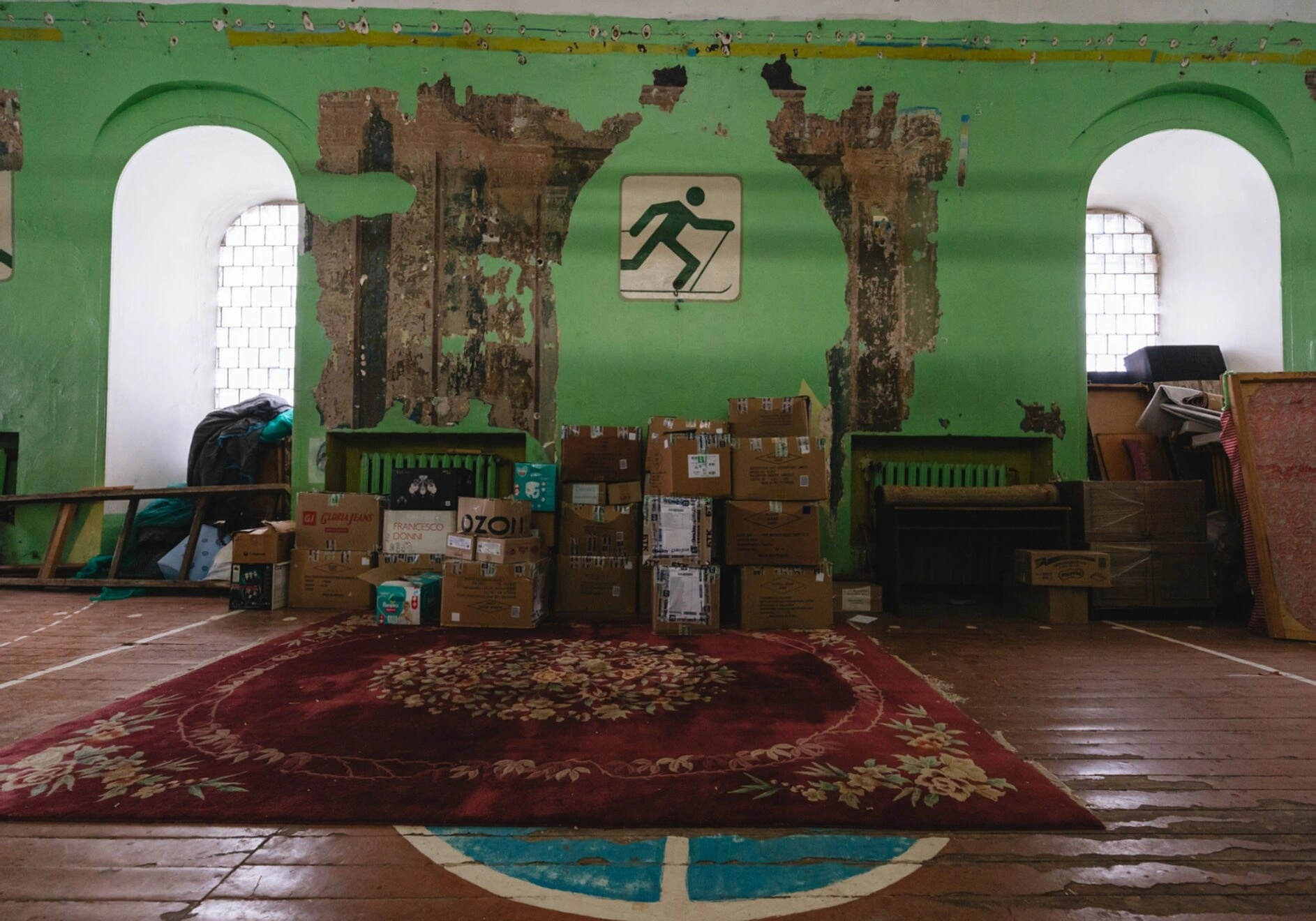 Вдоль стен сложены картонные коробки с надписями российского онлайн-ритейлера, а также элементы церковной мебели и утвари, что указывает на ведущиеся работы по благоустройству и перенесение временно хранящихся предметов. Присутствие лестницы свидетельствует о многоуровневой структуре храмового комплекса. Несмотря на временный беспорядок, в этом пространстве ощущается дух православной истории и надежда на скорое восстановление былого величия этого намоленного места, освящённого во имя воспоминания Распятия Спасителя.