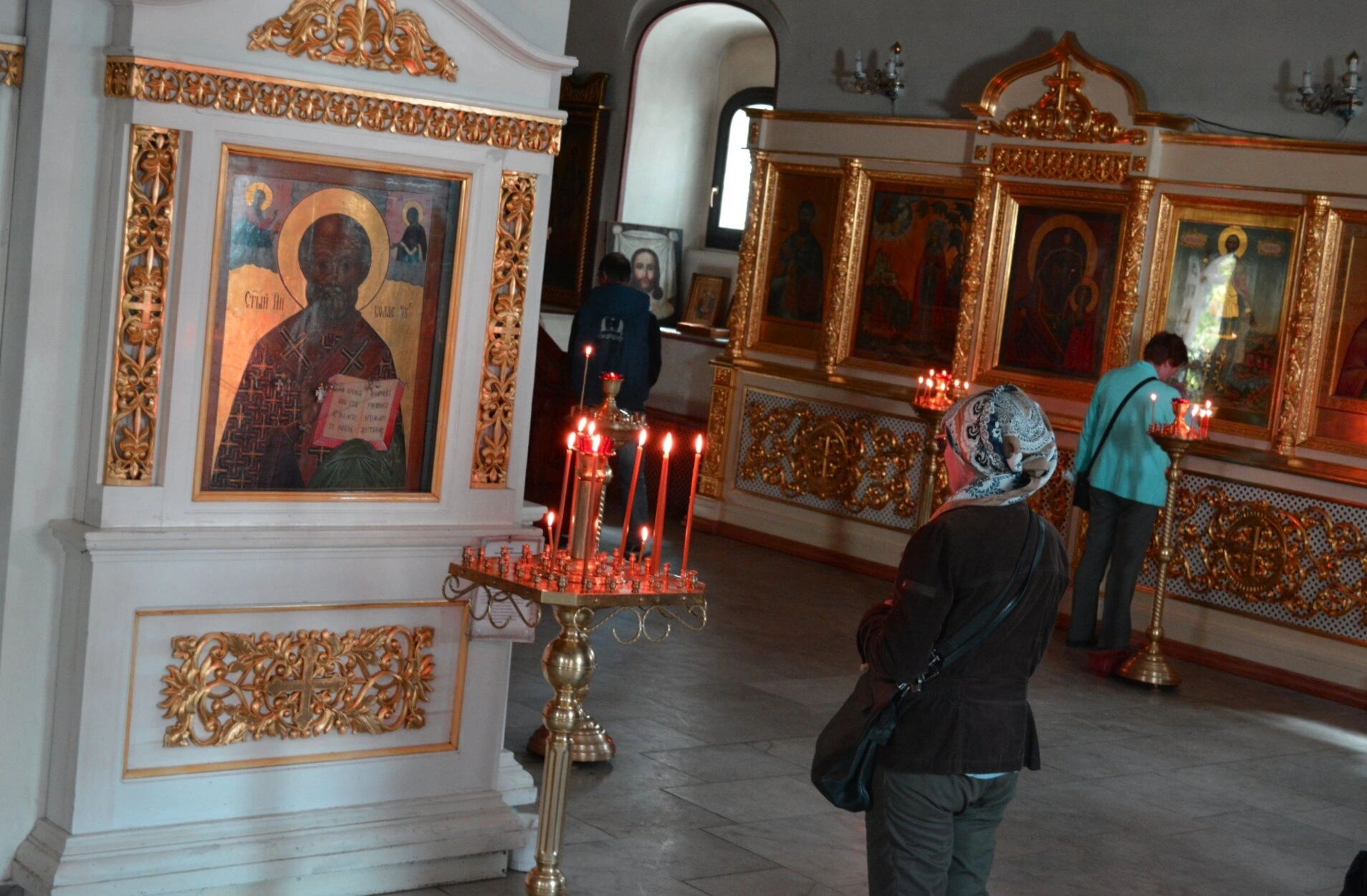 Справа от центрального подсвечника возвышается многоярусный иконостас, украшенный золочёными резными деталями. Иконы в драгоценных окладах расположены в строгом соответствии с православной традицией. В глубине храма видны фигуры прихожан, погружённых в молитвенное созерцание.