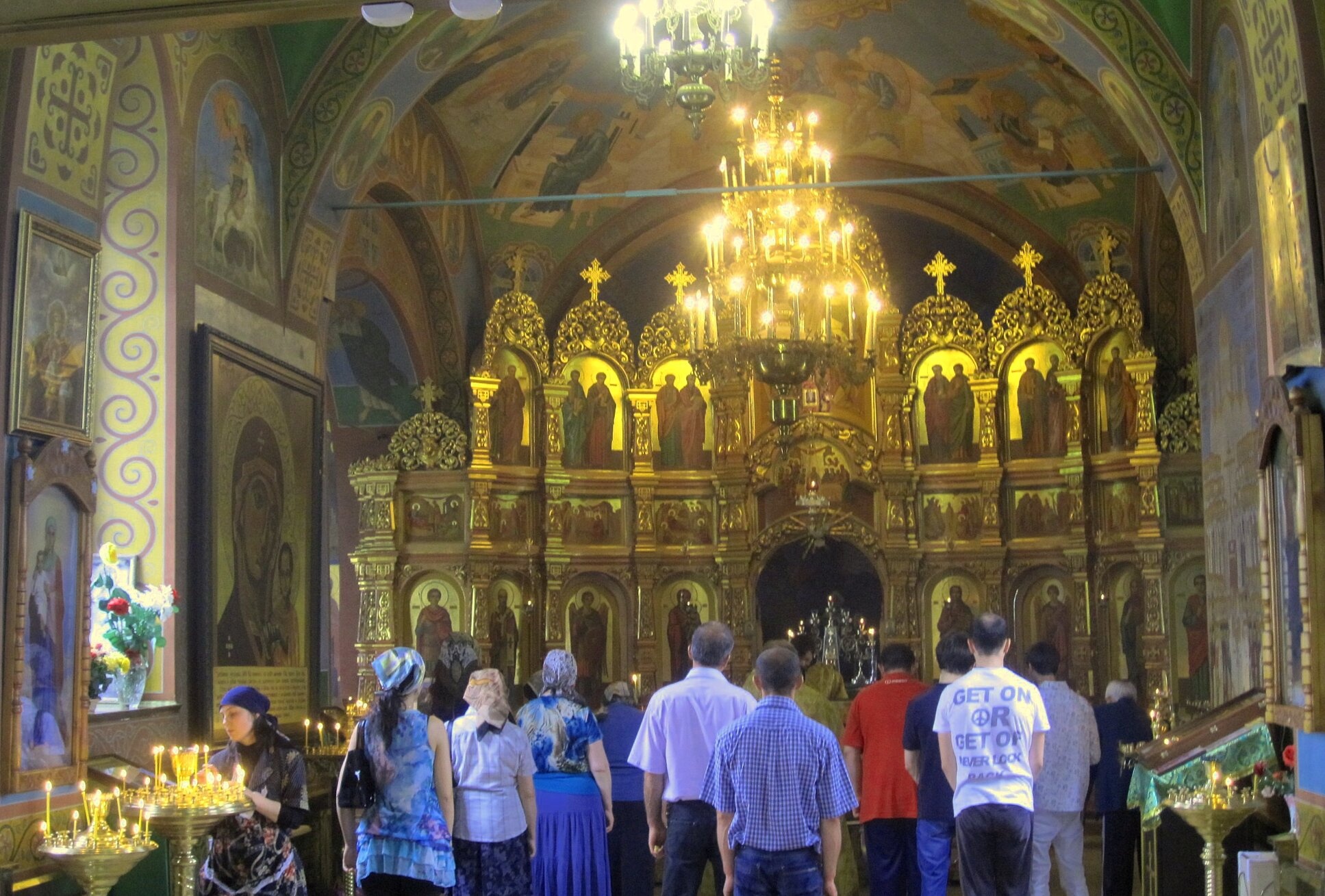 На фотографии запечатлён благолепный интерьер старейшего православного храма Владикавказа — Осетинской церкви в честь Рождества Пресвятой Богородицы. Снимок передаёт атмосферу молитвенного сосредоточения и благоговения во время совершения богослужения.