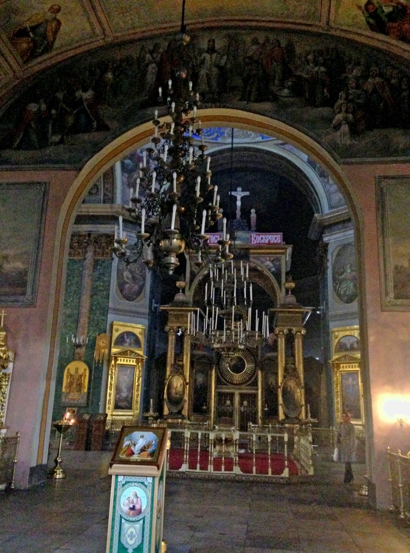 Взору открывается вид на центральную часть храма, где особое внимание приковывает монументальный многоярусный иконостас. Его резные позолоченные царские врата и изящные обрамления иконных киотов свидетельствуют о высоком искусстве мастеров. Росписи на стенах и сводах, выполненные в канонической православной традиции, изображают лики святых и евангельские сцены, создающие особую молитвенную атмосферу.