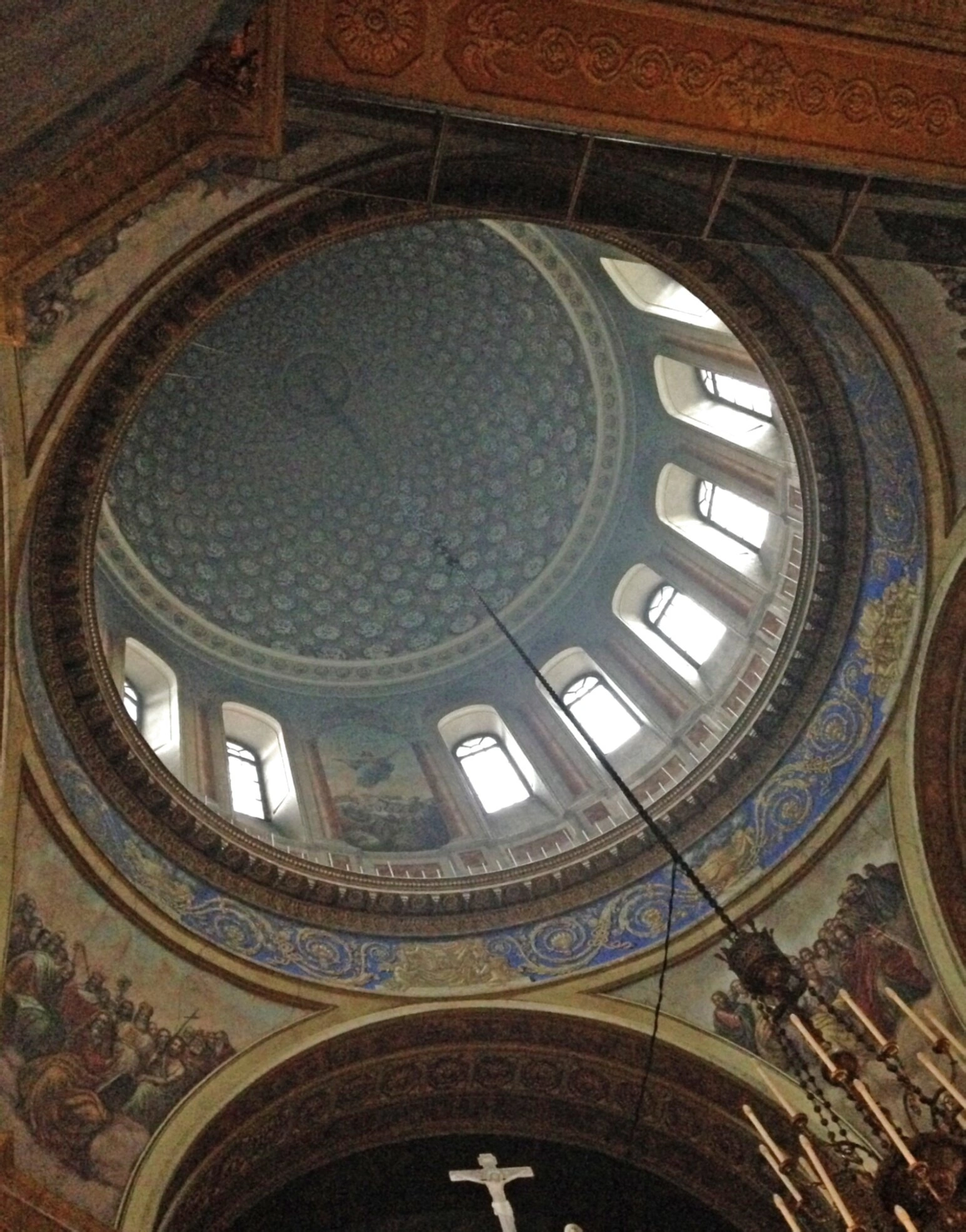 Ниже купола живописно свисает массивное центральное паникадило, свидетельствующее о благолепии и богатом убранстве церкви. Многоярусные хрустальные подвески и сложная металлическая работа светильника указывают на высокий уровень мастерства русских литейщиков и художников XIX века.