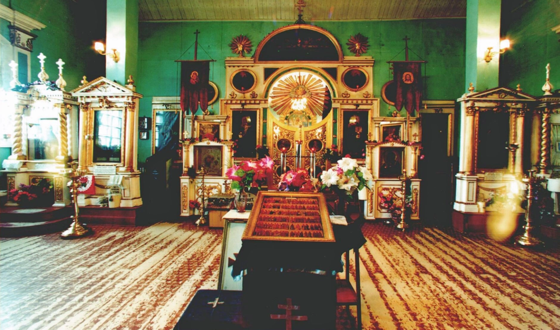 Центральное место в композиции снимка занимает величественный трёхъярусный иконостас, выполненный из дерева и украшенный золочёной резьбой. Его венчают золочёные Царские Врата, являющиеся особой святыней и произведением церковного искусства. Этот иконостас имеет особую историческую ценность, так как был перенесён в храм после Великой Отечественной войны из Александро-Невской церкви.