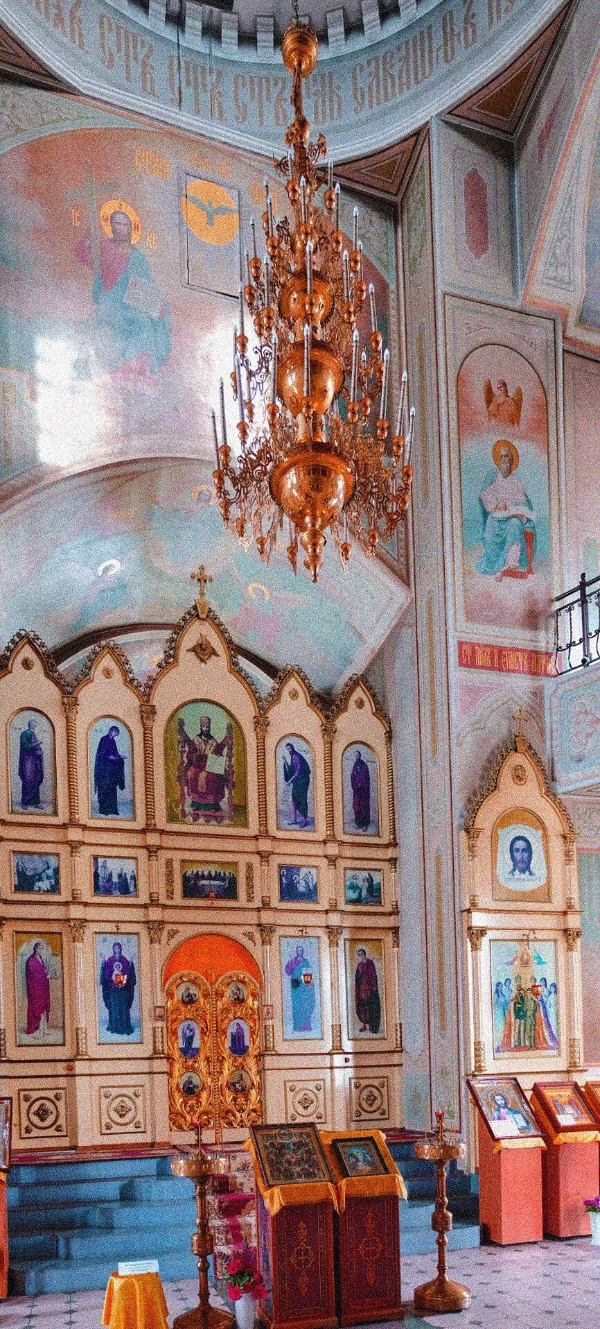 Под сводами храма сияет массивная позолоченная люстра — паникадило, которое во время богослужения зажигается, символизируя собою свет Христов, просвещающий всех людей. В нижней части кадра видны аналои, на которых возложены особо чтимые иконы для поклонения верующих, а также иная церковная утварь, используемая при совершении таинств и треб.