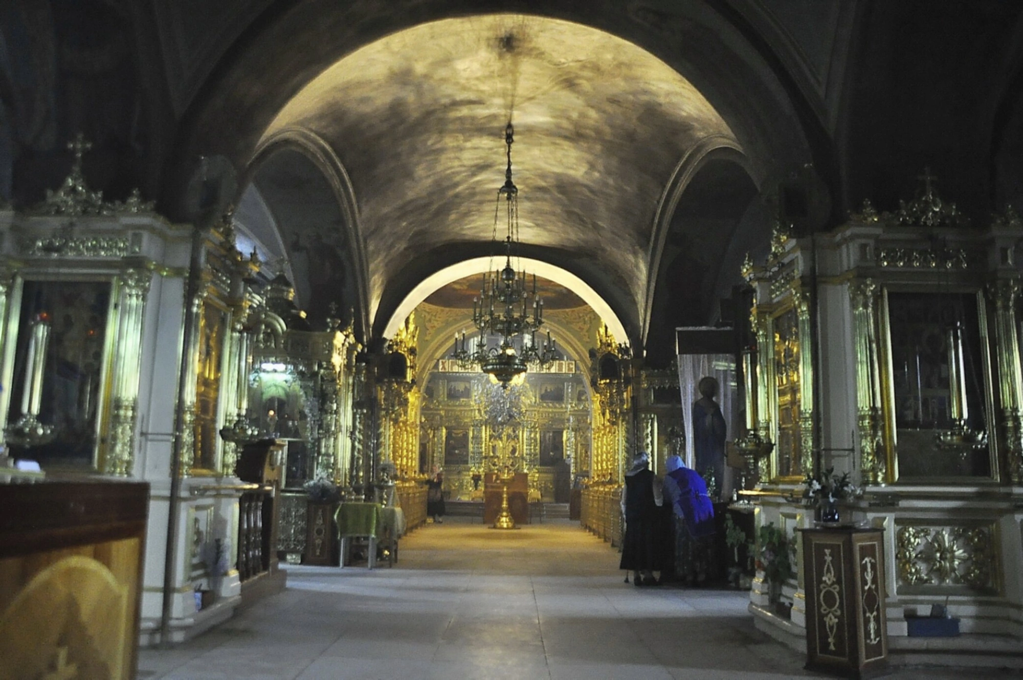 Вдоль стен и у колонн расположены стасидии и аналои с праздничными иконами, а также подсвечники, перед которыми верующие возжигают свечи. На снимке также видны прихожане, что позволяет оценить масштаб сооружения и передаёт живую атмосферу действующего храма, являющегося местом соборной молитвы и приобщения к благодати.