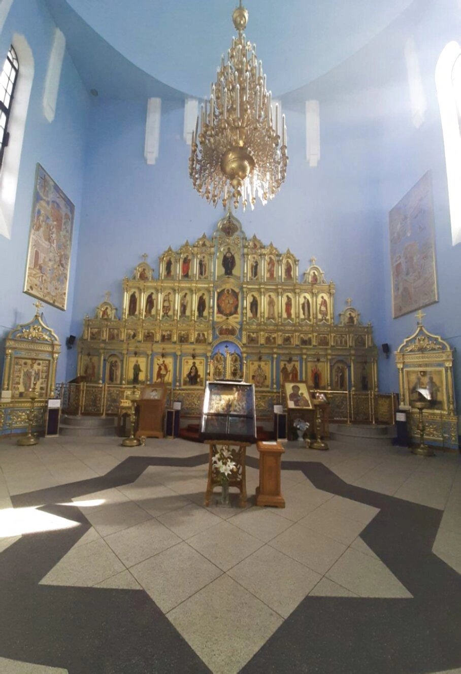 Под сводами храма, окрашенными в небесно-голубой цвет, возносится богато украшенная паникадила - центральная церковная люстра, символизирующая небесный свет. Многочисленные светильники освещают пространство, создавая особую молитвенную атмосферу. Стены храма также выдержаны в светлых голубых тонах, на которых размещены большие иконы в резных киотах и рамках.