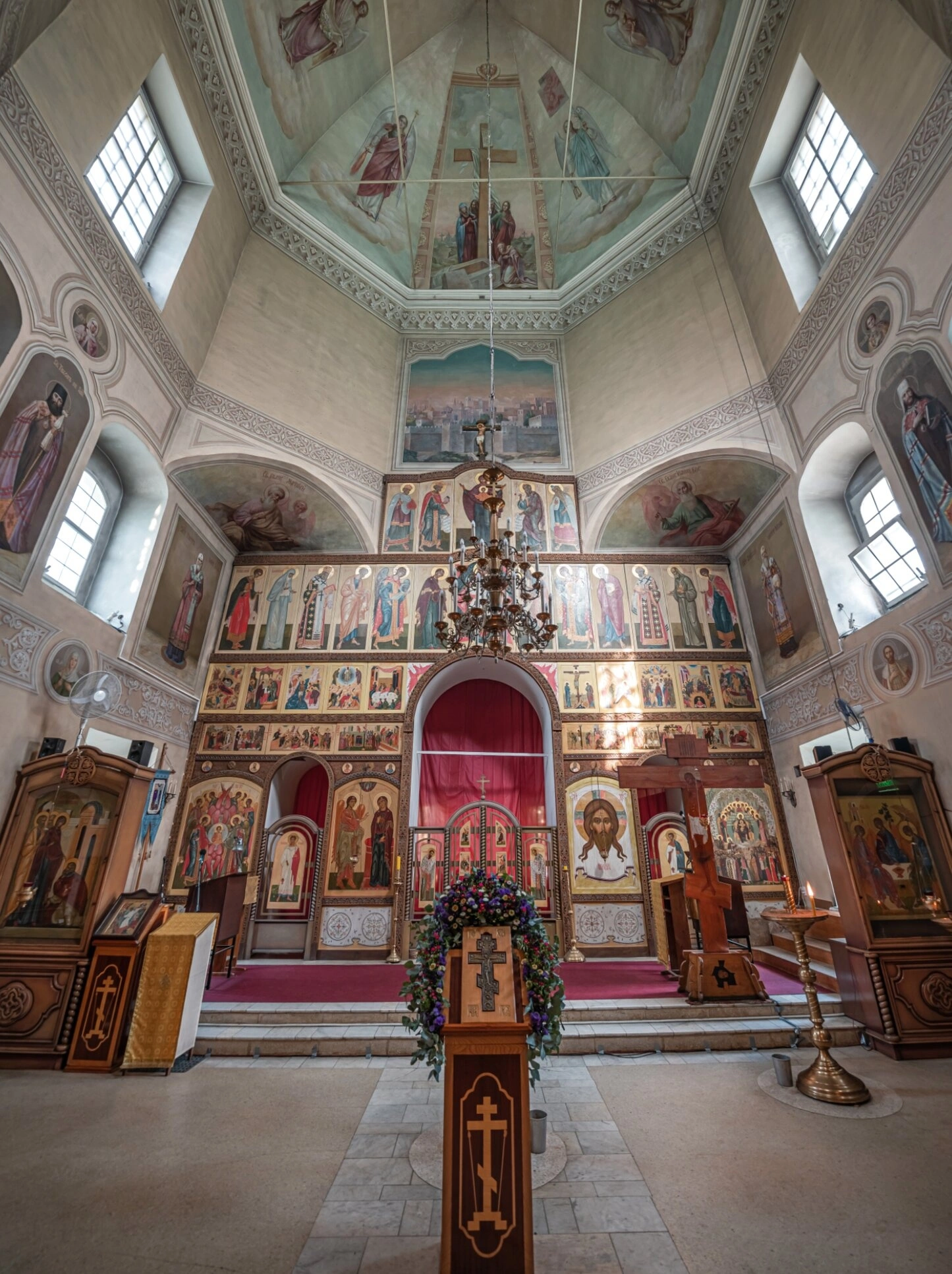 Освещение, падающее из верхних окон, мягко высвечивает царские врата и образы святых на иконах, наполняя интерьер тёплым сиянием. Видны богато украшенные паникадила, готовые озарить светом всё помещение во время вечернего богослужения. Каждый элемент убранства — от аналоя до росписей на стенах и сводах — свидетельствует о глубокой истории этого намоленного места и продолжении древних традиций русского церковного искусства.