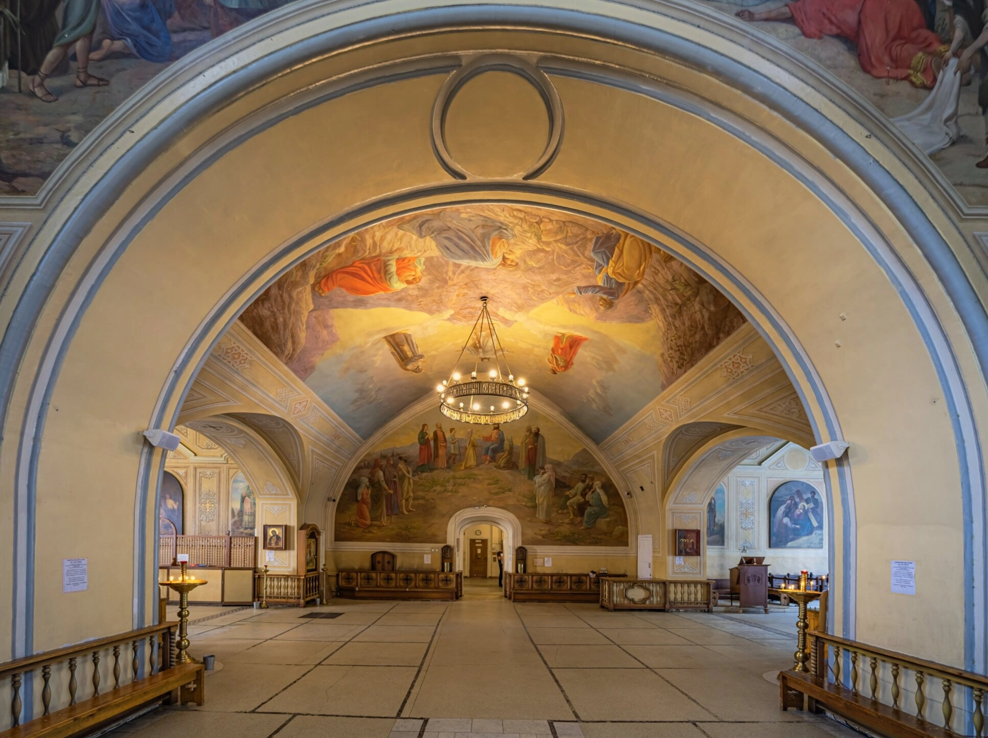 Стены и своды храма обильно украшены нарядными фресками и священными росписями, выполненными в канонической православной манере. Масштабные композиции изображают евангельские сюжеты и лики почитаемых святых, наставляя верующих и созидая молитвенное настроение. В центре пространства, под купольным пространством, располагается большое паникадило, от которого исходит мягкий свет, озаряющий святыни и способствующий сосредоточенной молитве.