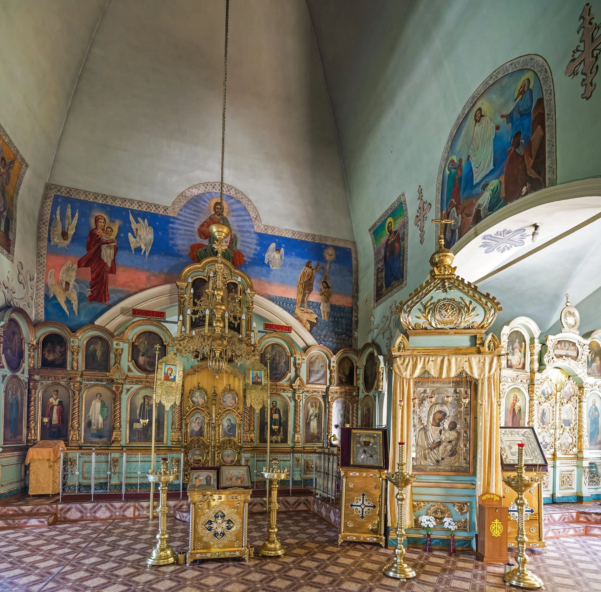 Стены и своды храма украшены фресковыми росписями, изображающими библейские сюжеты и лики святых. Эти художественные произведения создают особую молитвенную атмосферу и служат наглядным повествованием о важнейших событиях Священной истории. В центральной части храма расположено массивное позолоченное паникадило, символизирующее небесный свет и исполняющее роль духовного светильника во время вечерних богослужений.