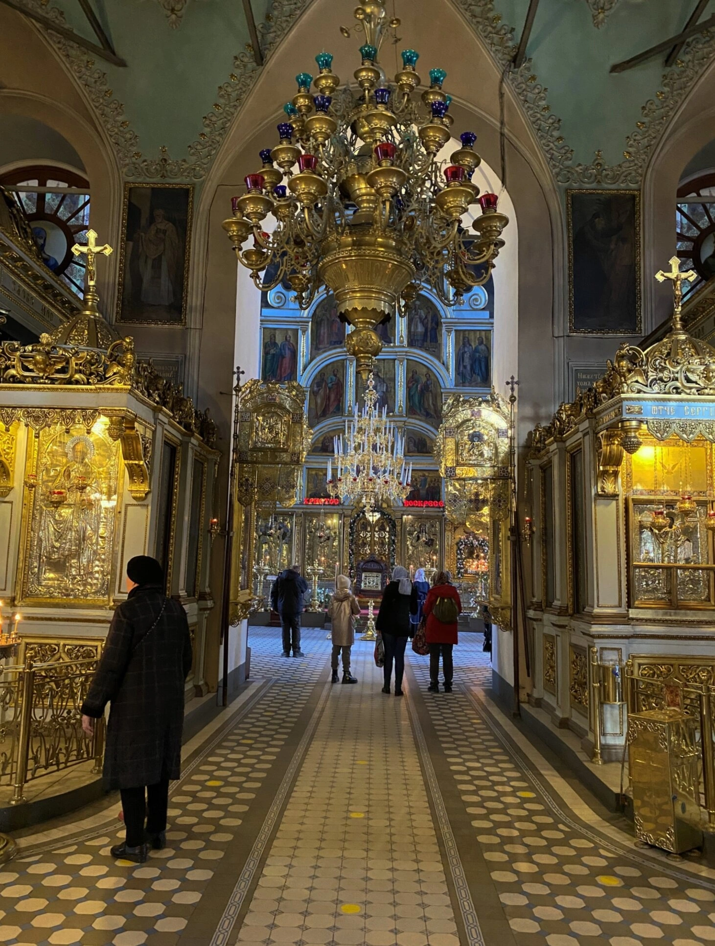 Перспектива кадра выстроена вдоль центрального нефа, устремляющего взгляд к святому алтарю. По обе стороны располагаются величественные, украшенные резьбой и золотом иконостасы, в которых находятся почитаемые иконы. Сводчатые потолки храма богато расписаны фресками на библейские сюжеты и дополнены лепным декором.