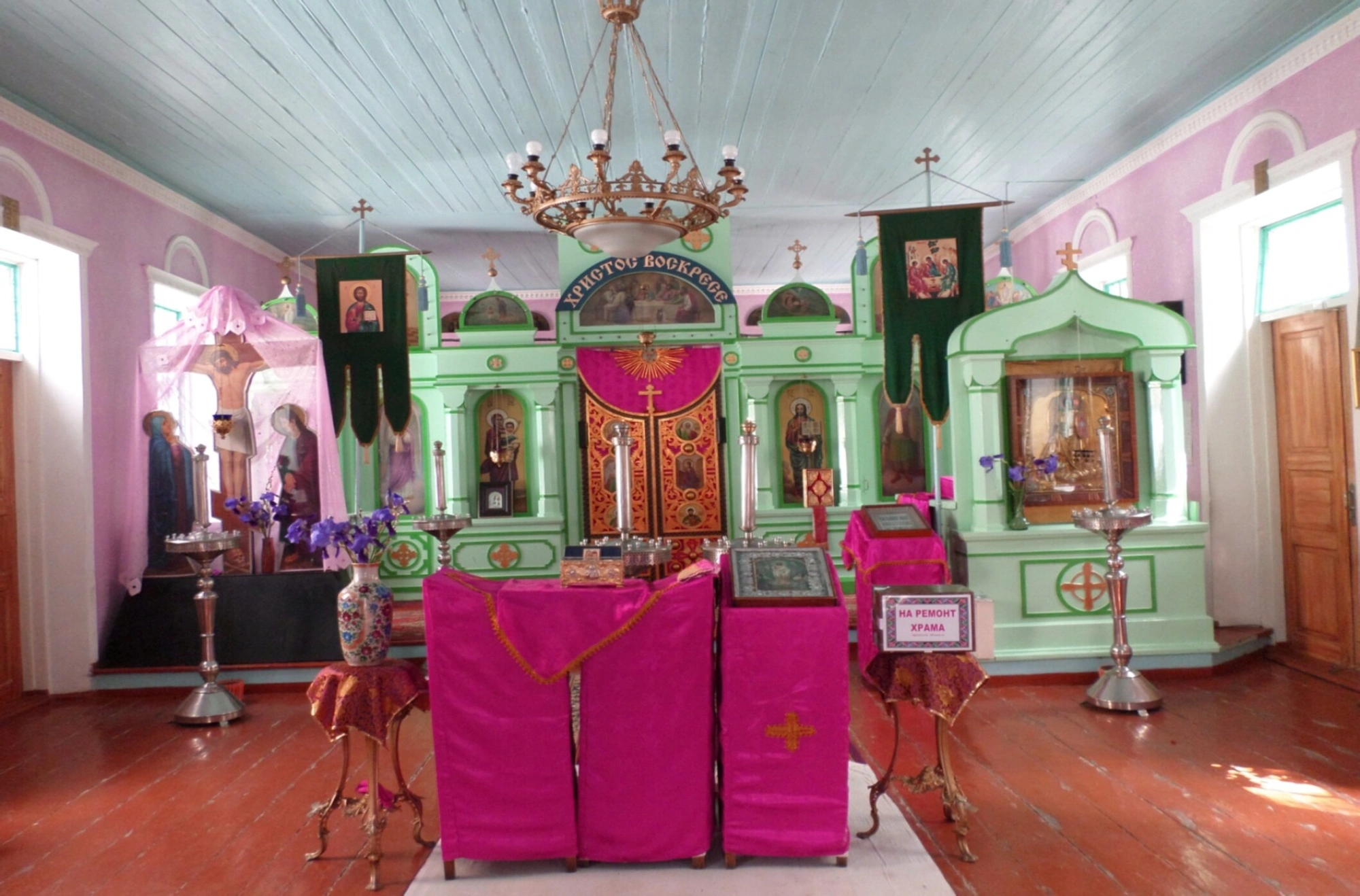 Вдоль стен храма и перед святыми образами установлены аналои, на которые возлагаются праздничные иконы, и подсвечники, куда верующие ставят свечи с молитвой. Ярко-розовые покровы на столах добавляют торжественности убранству. Один из столов предназначен для сбора пожертвований на благое дело, о чём гласит табличка с надписью «НА РЕМОНТ ХРАМА».