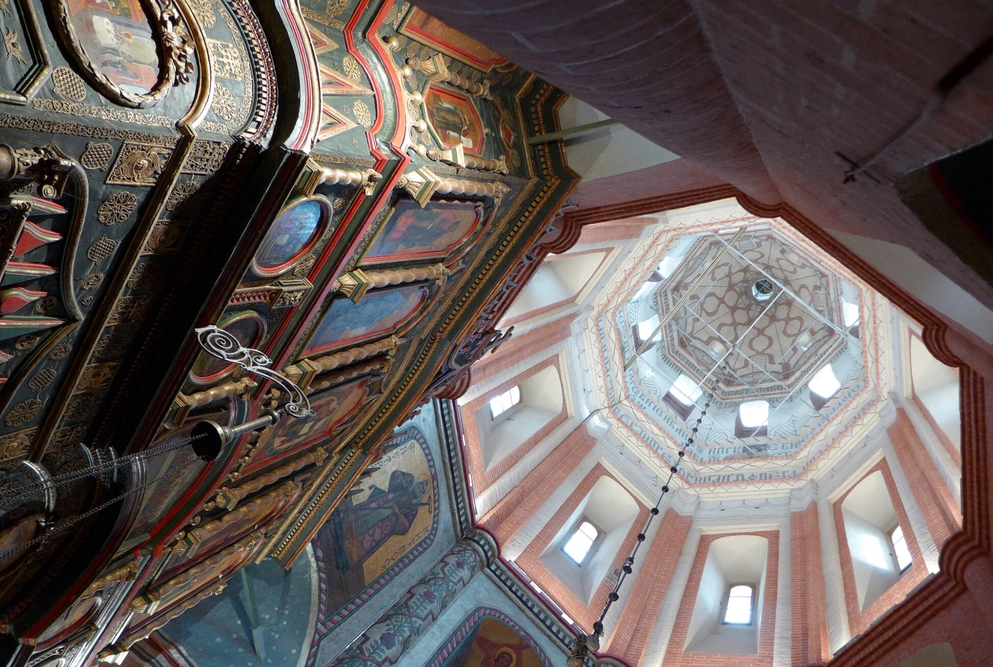 В левой части кадра открывается вид на богато украшенный кессонный потолок. Позолоченные резные элементы и орнаменты обрамляют небольшие, словно оконца в горний мир, иконы в прямоугольных и овальных киотах. Этот плоскостной, но насыщенный декор контрастирует с устремлённостью ввысь, которую воплощает правая часть композиции.