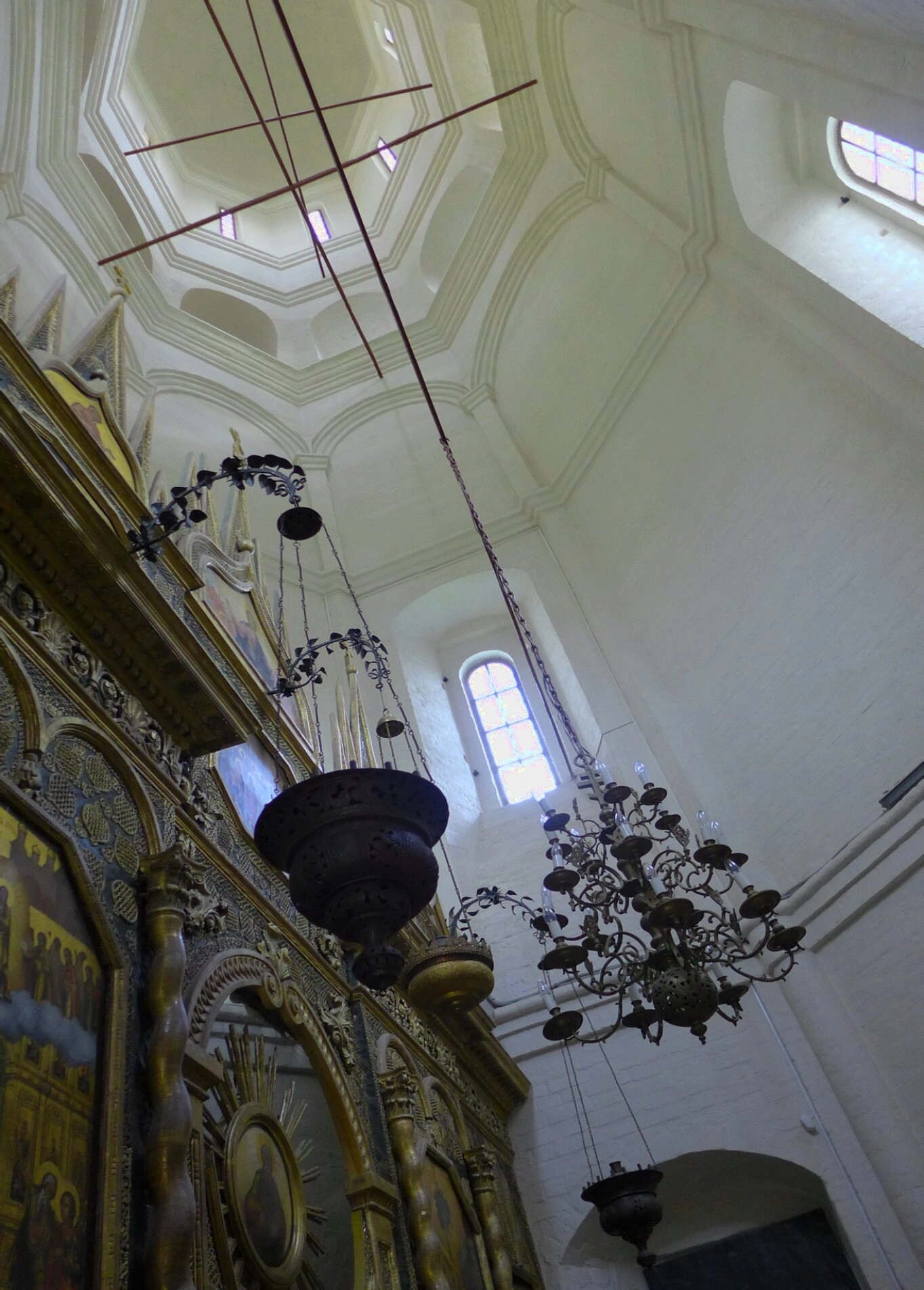Внутреннее пространство, изображённое на снимке, являет взору величественную красоту и благолепие. Архитектурной доминантой кадра выступает высокий, многоярусный иконостас, украшенный резьбой по дереву и увенчанный рядами святых образов. Сводчатые потолки и стены храма, характерные для XVI столетия, создают особую, возвышенную атмосферу молитвенного сосредоточения. С небесного свода на массивных кованых цепях ниспускается большое паникадило — центральная храмовая люстра, чей свет символизирует Божественное освещение верующих.