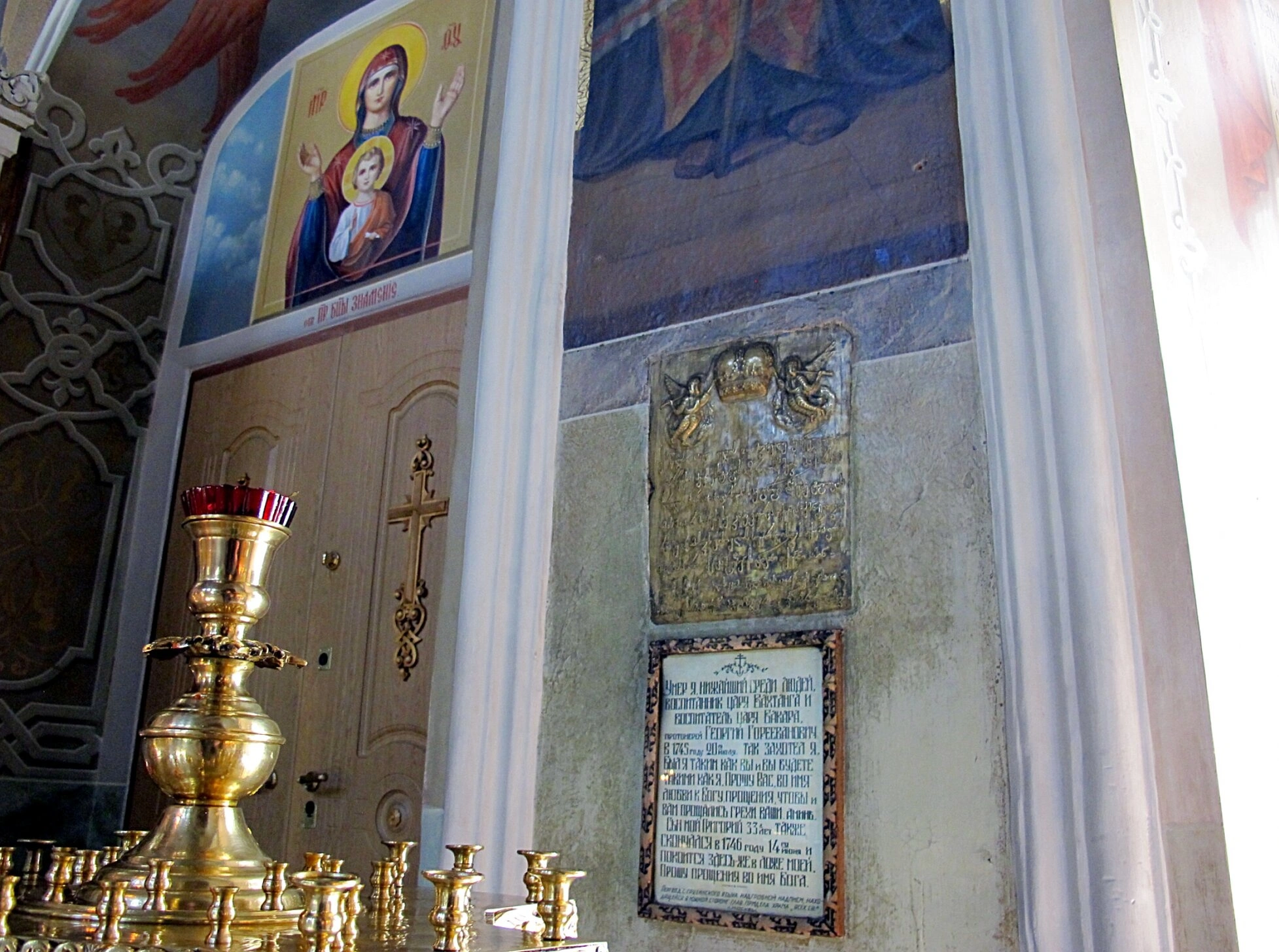 Слева над деревянной дверью, украшенной коваными элементами, находится икона Пресвятой Богородицы с Младенцем Христом. Справа от подсвечника на стене размещена большая фреска с изображением святых, выполненная в канонической манере. Росписи и иконы в храме создают особую молитвенную атмосферу, напоминая о небесном заступничестве.