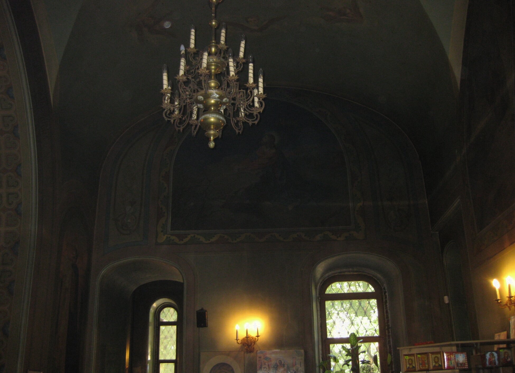 Сводчатые потолки и стены храма щедро украшены христианскими фресками и орнаментальной росписью, хотя детали их из-за освещения сокрыты в благочестивой полумгле, призывающей к сосредоточенному созерцанию. Справа от зрителя угадывается часть иконостаса — небесной преграды, отделяющей алтарь от основного пространства храма, а также аналои и полки для богослужебных книг.