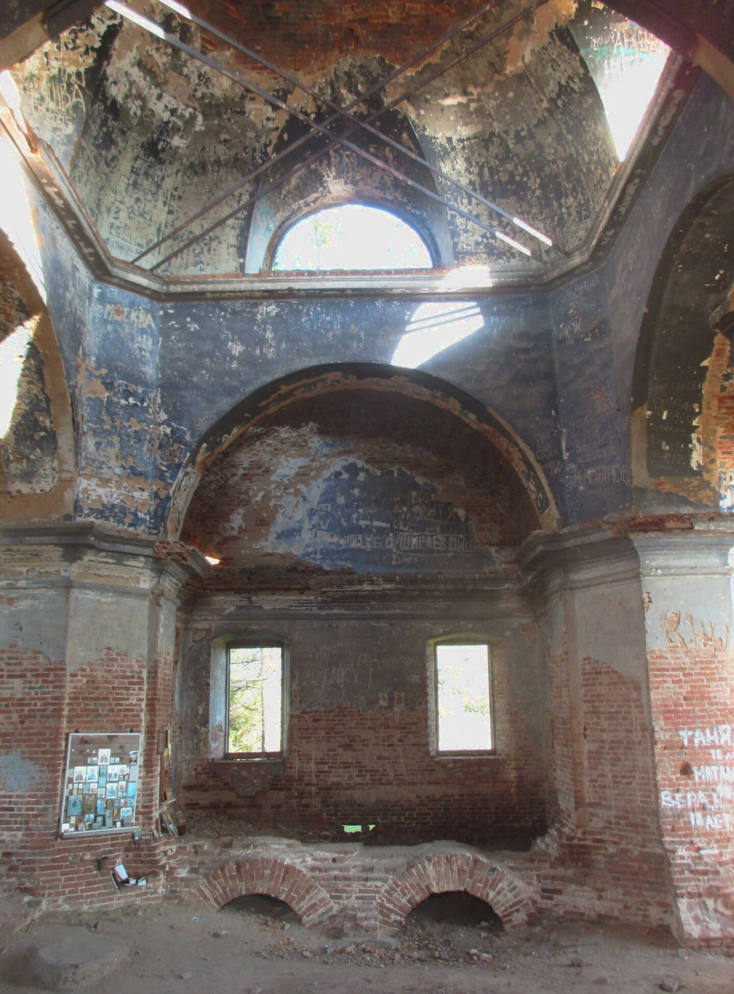 На одной из стен внимательный взор различит сохранившийся предмет, напоминающий о молитвенном назначении сего места — возможно, это остатки церковной доски для объявлений или расписания богослужений, к которой некогда прикреплялись листки с молитвами или иконами. Всё внутреннее убранство храма свидетельствует о бытовавшей здесь когда-то полноте церковной жизни, ныне требующей возрождения и молитвенного труда.