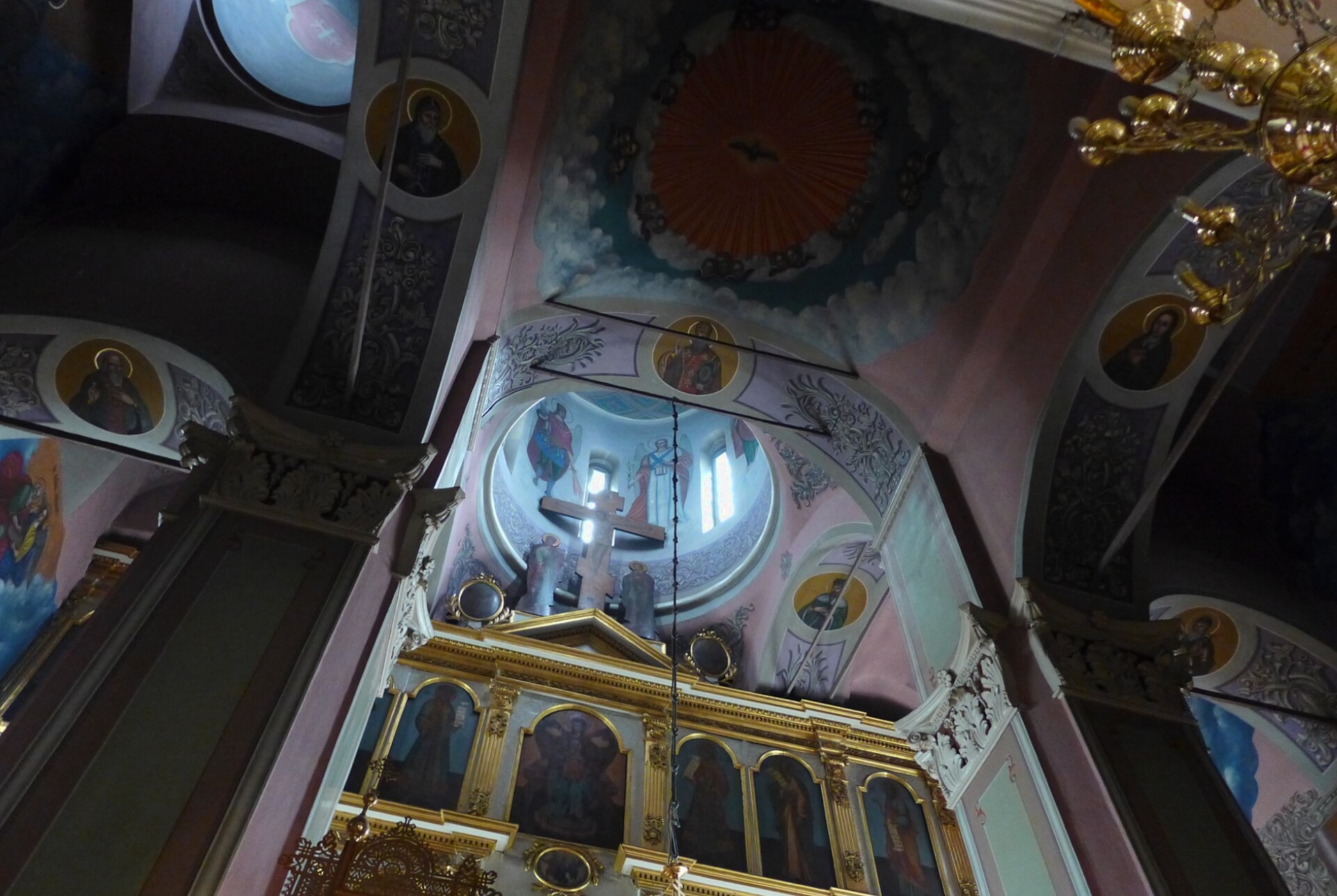 Величественное пространство храма наполнено благодатным светом, льющимся через оконные проёмы и создающим особую духовную атмосферу. На фотографии видны элементы церковного убранства: святые образа, лампады и детали резного иконостаса, которые свидетельствуют о непрерывной молитвенной жизни этой древней обители.