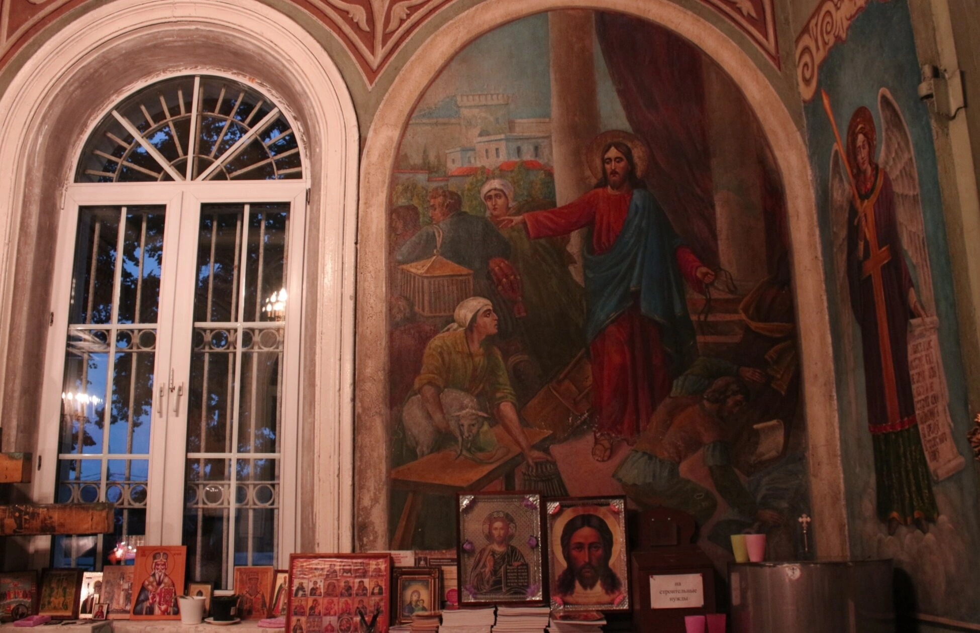 На фотографии запечатлён интерьер храма Живоначальной Троицы, расположенного в селе Болтино Московской области. Святыня является выдающимся образцом православной церковной архитектуры и искусства. Центральным элементом композиции выступает монументальная фреска, изображающая евангельское событие — Изгнание торгующих из храма. Данный сюжет символизирует очищение духовного пространства от мирской суеты и утверждение святости Дома Божия. Господь Иисус Христос представлен в момент совершения праведного гнева, обращённого к нарушителям благочиния.