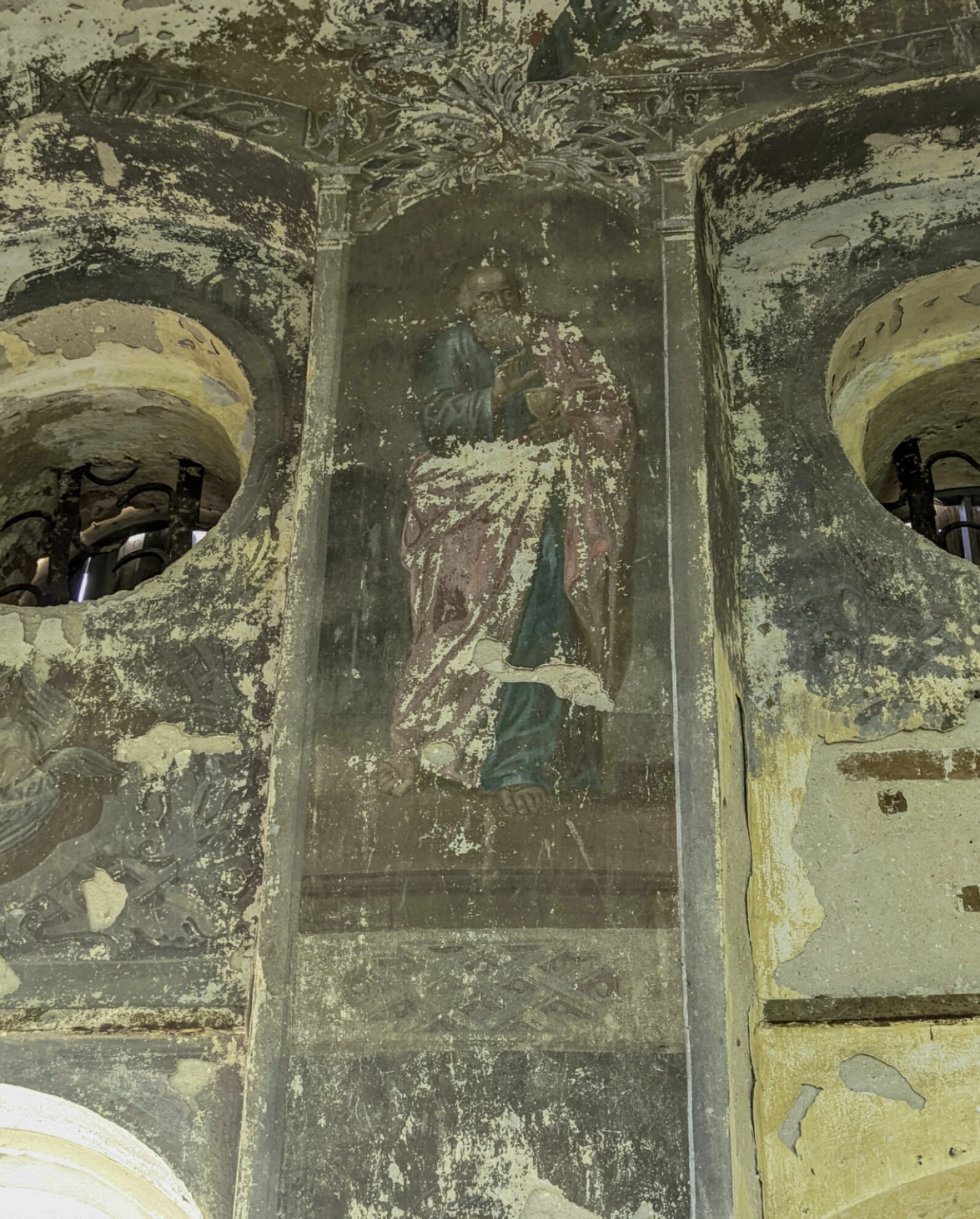 На представленной фотографии запечатлен фрагмент интерьера Церкви Ильи Пророка, расположенной в селе Малое Ильинское Переславского района. Снимок детально передает уникальную атмосферу старинного православного храма, находящегося в состоянии постепенного разрушения. Основное внимание сосредоточено на сохранившейся настенной росписи, размещенной в арочной нише.