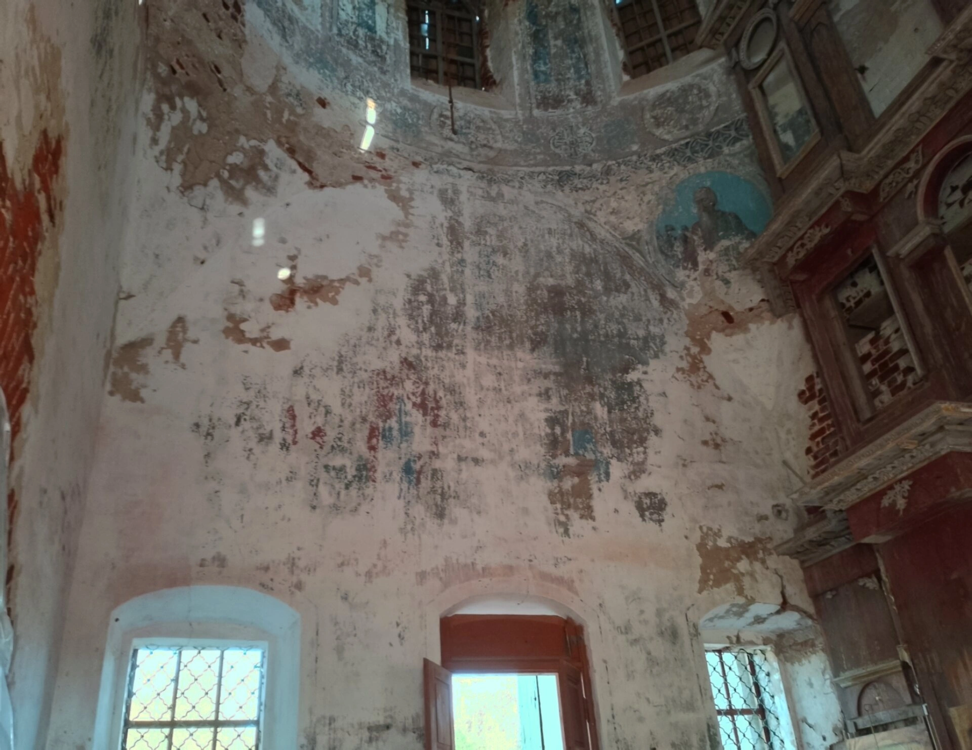 Несмотря на сильные повреждения, на стенах и сводах храма ещё различимы фрагменты древней настенной росписи. Под слоем осыпавшейся штукатурки и копоти угадываются лики святых и элементы орнамента, выполненные руками благочестивых мастеров. Особое внимание привлекают оконные проёмы, украшенные коваными решётками, через которые в опустевшее пространство храма проникает естественный свет, символически напоминая о Божественном свете, некогда озарявшем эту святыню.