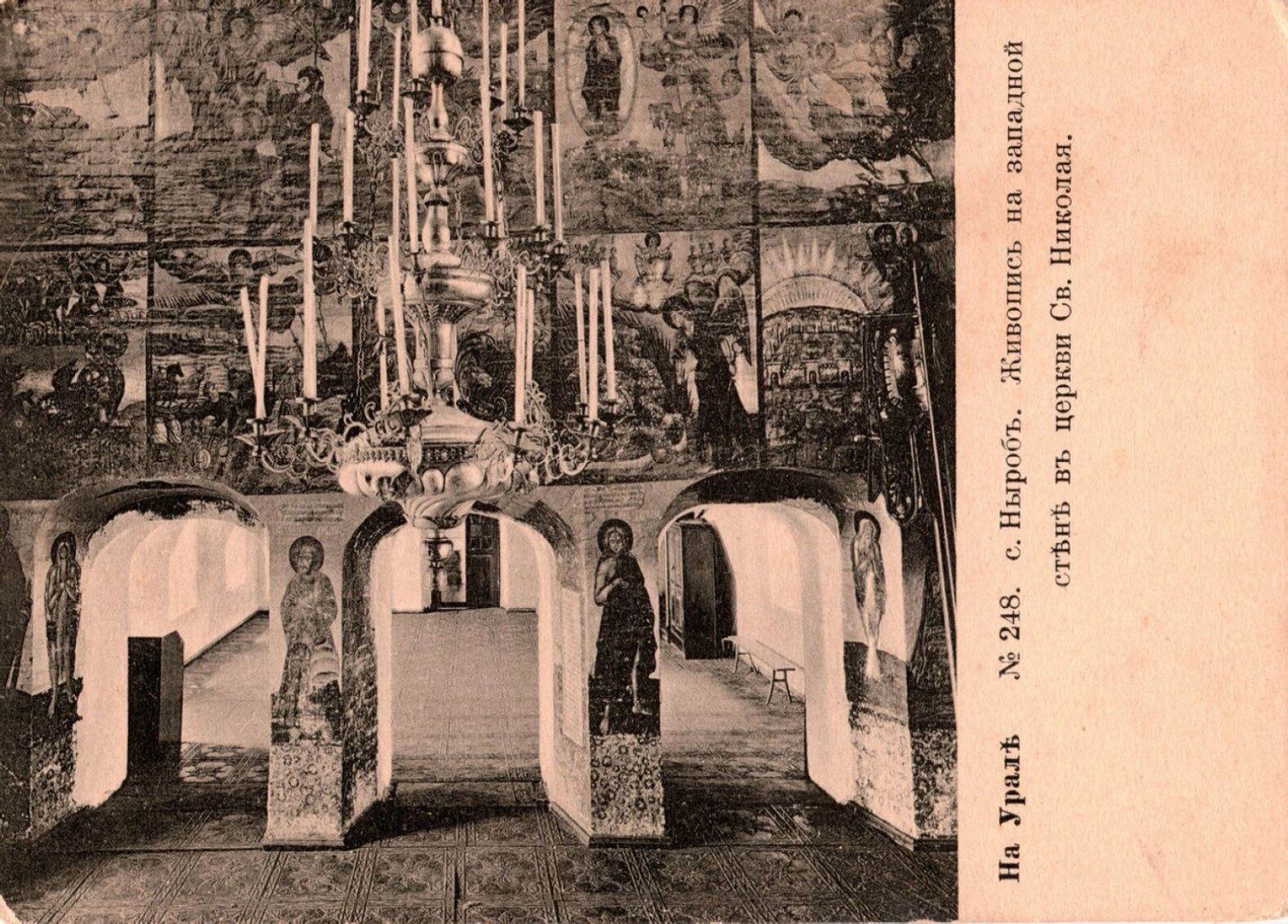 На представленной фотографии запечатлён величественный интерьер церкви Святого Николая Чудотворца, что в селе Ныроб. Снимок раскрывает духовную и художественную атмосферу этого старинного храма, являющегося объектом культурного наследия. Центральное место в композиции занимает монументальная фресковая роспись на западной стене, выполненная в традициях православной иконографии. Росписи изображают библейские сцены и лики святых, служащие наставлением для верующих и воплощением божественного замысла.