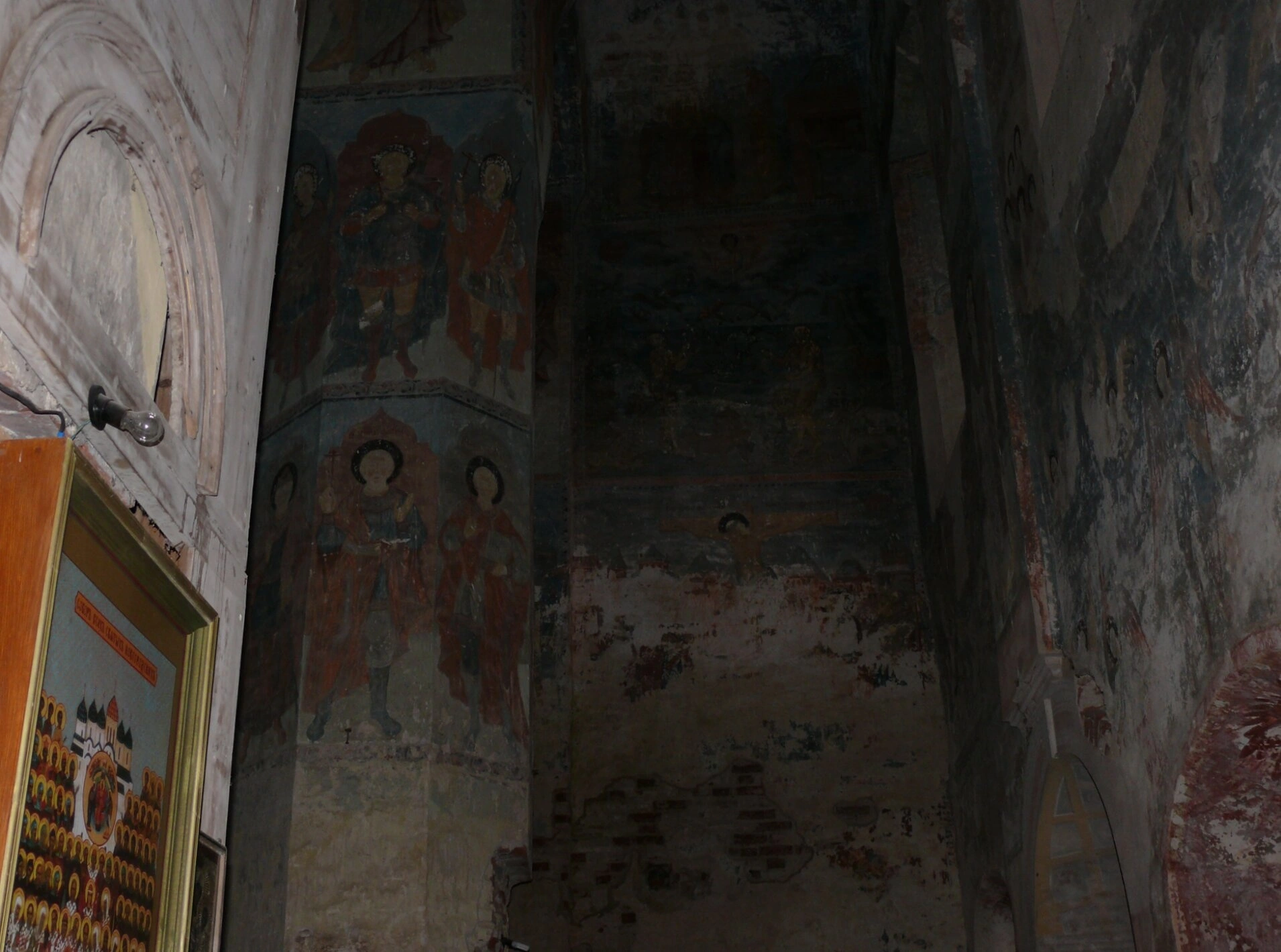 Особый интерес представляют собой старинные фрески, украшающие стены и своды храма. На фотографии видны лики святых и композиции на библейские сюжеты, выполненные в традиционной манере православной иконописи. Колорит росписей, основанный на глубоких, насыщенных тонах, подчёркивает духовную глубину и величие изображённых событий.