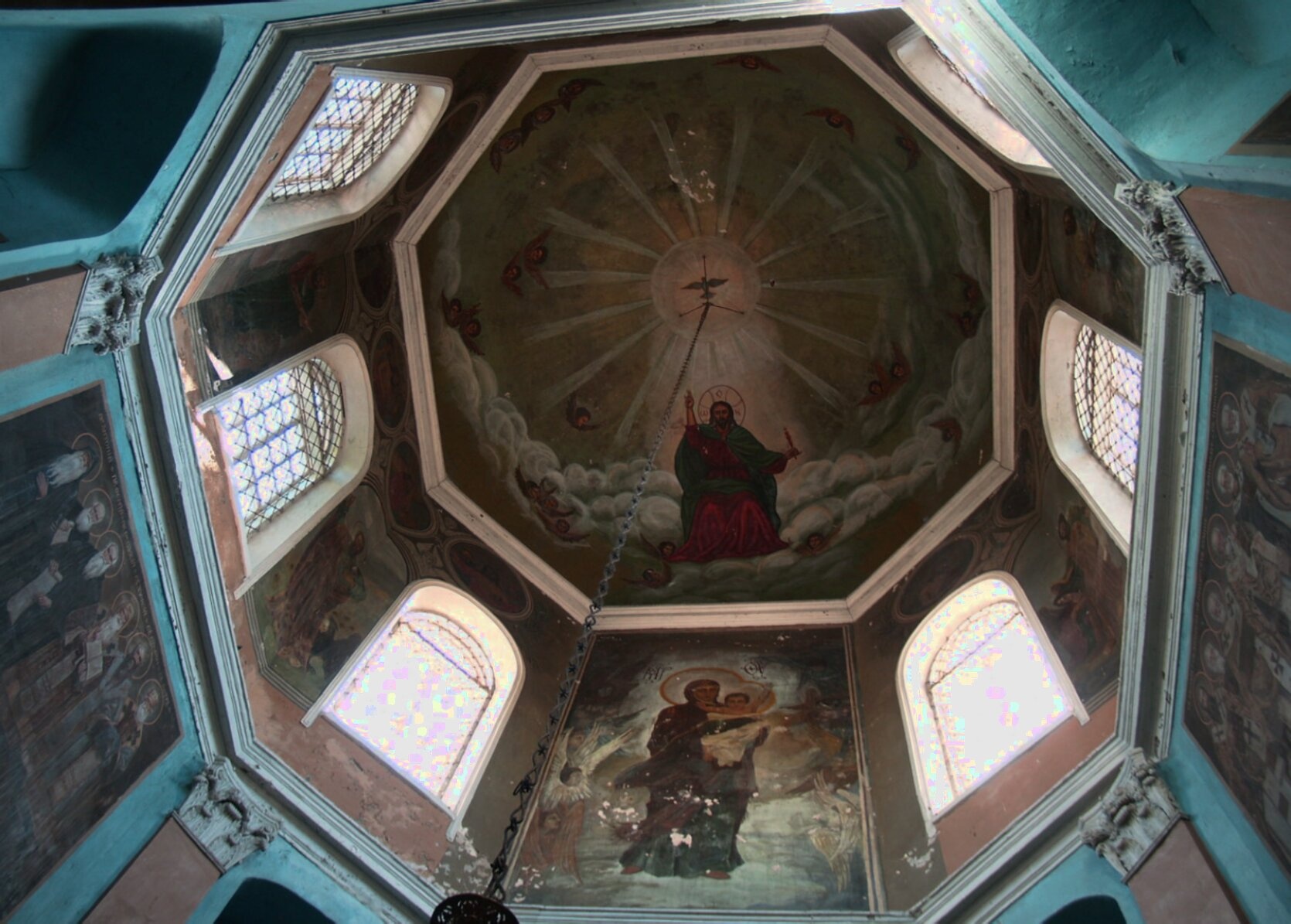 В центре композиции фотографии находится световой барабан, прорезанный высокими арочными окнами, которые заливают внутреннее пространство храма естественным светом, символизирующим Божественное просвещение. Основное внимание приковывает монументальная фресковая роспись, украшающая свод купола и паруса. В традициях православной иконографии в центральном медальоне купола, вероятно, располагается поясное изображение Господа Вседержителя (Пантократора), благословляющего предстоящих.
