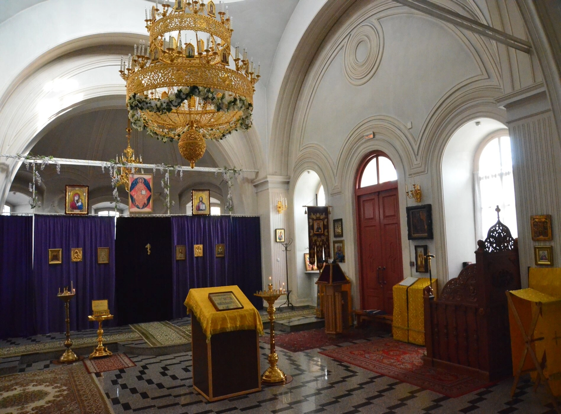 По периметру церковного пространства размещены святые образа. Иконы установлены как на стенах, так и на специальных церковных аналоях, предназначенных для молитвенного поклонения верующих. Некоторые святыни укрыты синими завесами, что соответствует православной традиции почитания особо чтимых образов.